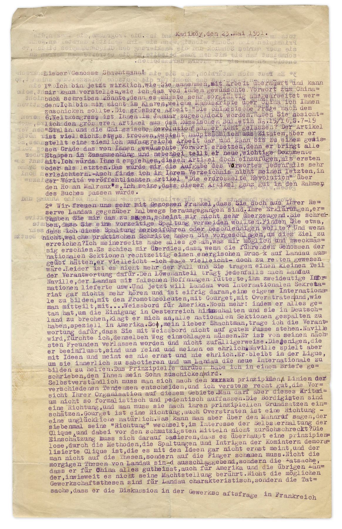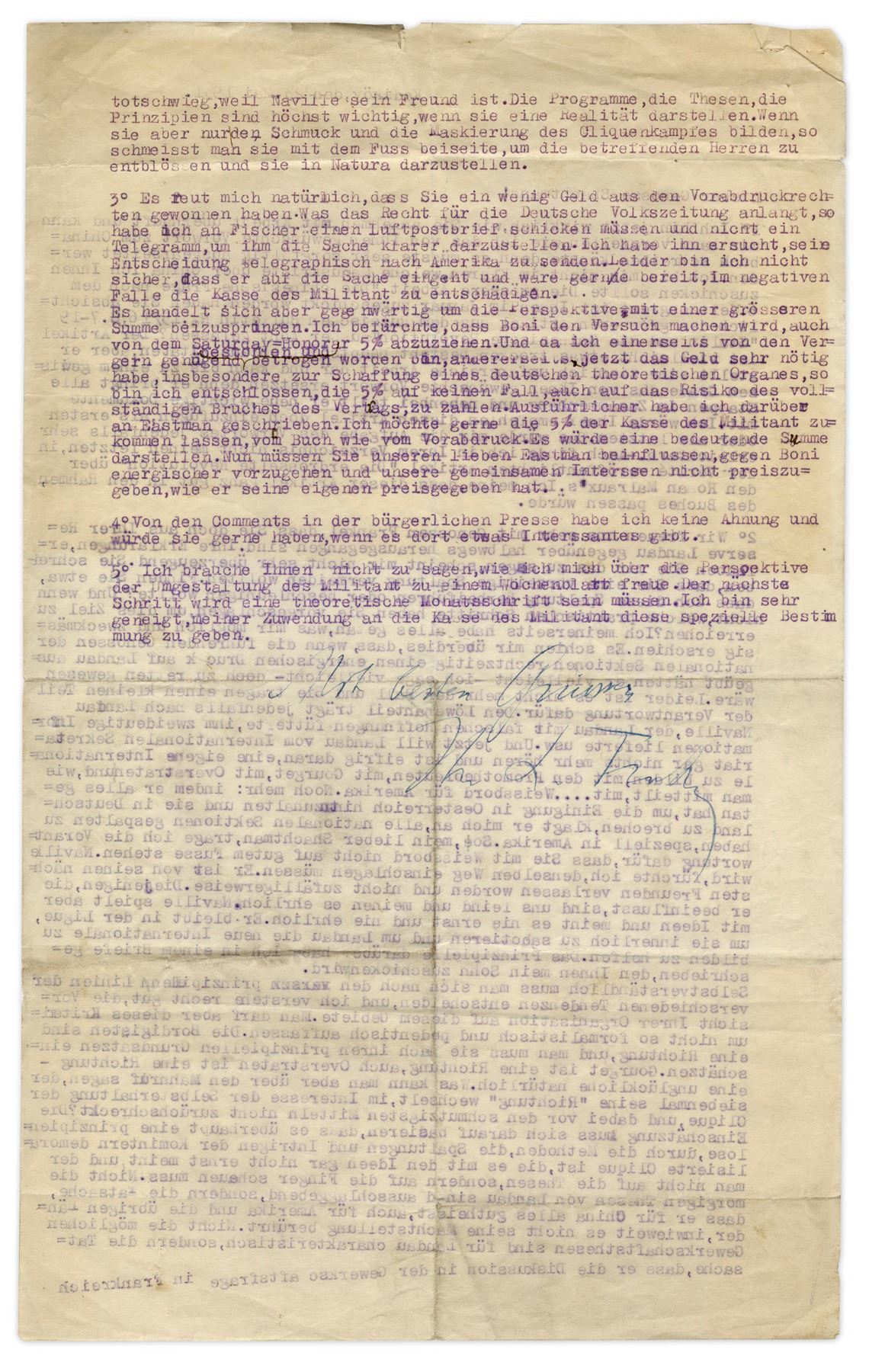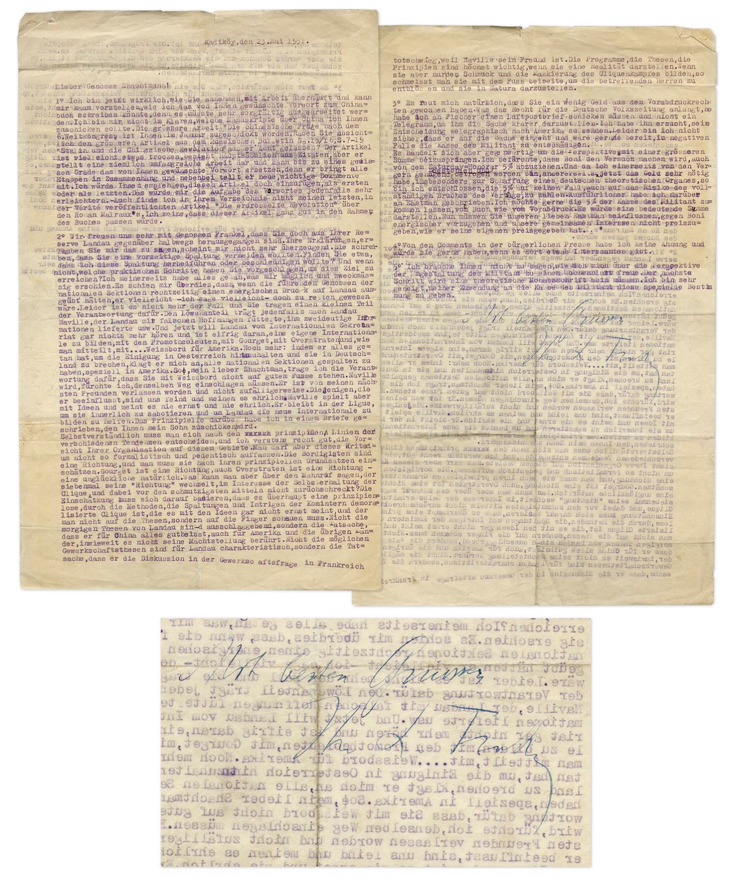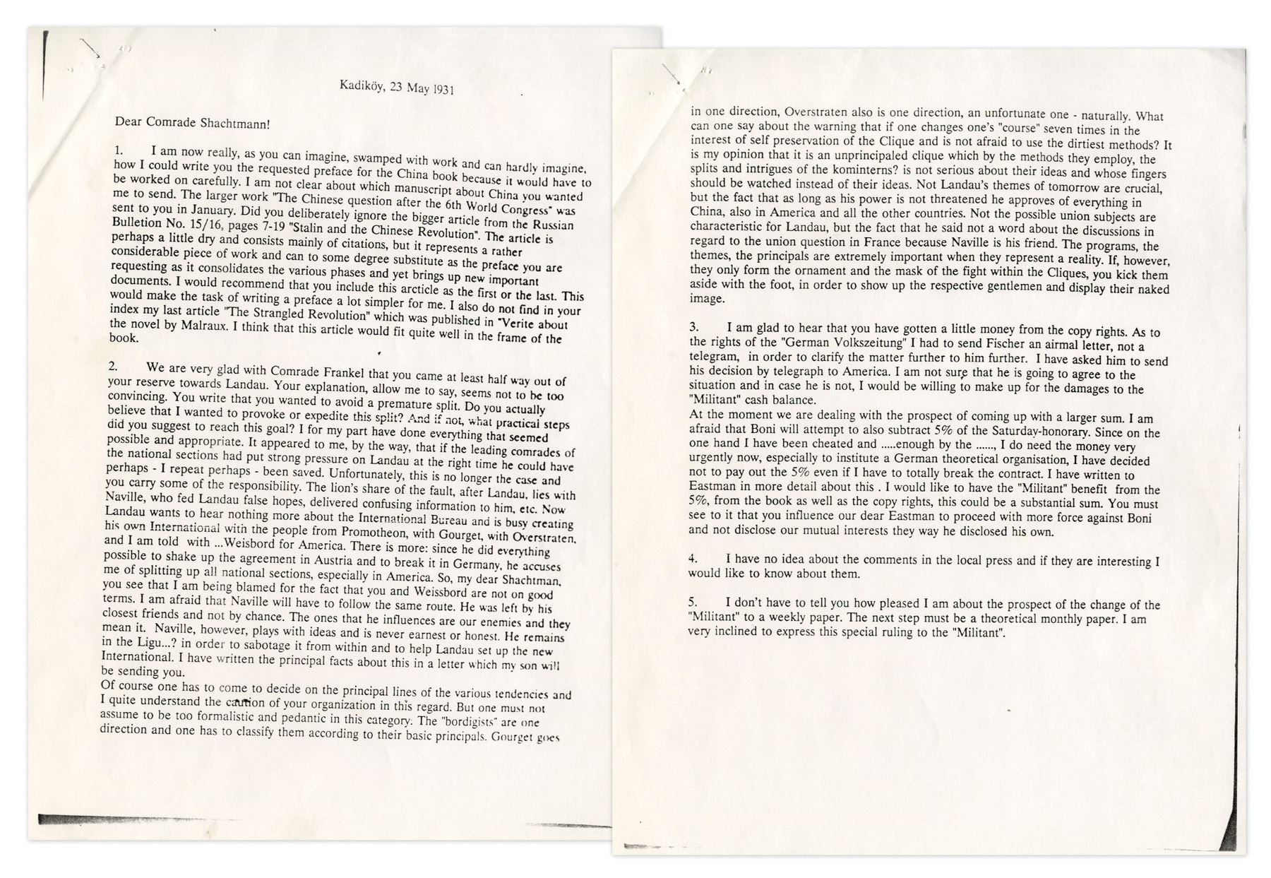 Fantastic and scarce letter signed by Leon Trotsky, dated 23 May 1931 from Kadikoy, Turkey, where Trotsky was exiled by Joseph Stalin, struggling not only to stay relevant but also to stay alive. Trotsky writes to his close friend and comrade, Max Shactman on a host of subjects, most notably the factions developing within the Communist party after its takeover by Stalin. Signed ''L. Trotsky'' and written in German with an English translation, the densely written letter of some 95 typed lines reads in part, ''...I am now really, as you can imagine, swamped with work and can hardly imagine how I could write you the requested preface for the China book...Did you deliberately ignore the bigger article from the Russian Bulletin No. 15/16, pages 7-19 'Stalin and the Chinese Revolution'...I also do not find in your index my last article 'The Strangled Revolution'...We are very glad with Comrade [Jan] Frankel that you came at least half way out of your reserve towards [Kurt] Landau. Your explanation, allow me to say, seems not to be too convincing. You write that you wanted to avoid a premature split. Do you actually believe that I wanted to provoke or expedite this split?...I for my part have done everything that seemed possible and appropriate. It appeared to me, by the way, that if the leading comrades of the national sections had put strong pressure on Landau at the right time he could have perhaps - I repeat perhaps - been saved. Unfortunately, this is no longer the case and you carry some of the responsibility. The lion's share of the fault, after Landau, lies with [Pierre] Naville, who fed Landau false hopes, delivered confusing information to him, etc. Now Landau wanted to hear nothing more about the International Bureau and is busy creating his own International...There is more: since he did everything possible to shake up the agreement in Austria and to break it in Germany, he accuses me of splitting up all national sections, especially in America. So, my dear Shactman, you see that I am being blamed for the fact that you and [Albert] Weissbord are not on good terms...Naville, however, plays with ideas and is never earnest or honest...What can one say about the warning that if one changes one's 'course' seven times in the interest of self preservation of the Clique and is not afraid to use the dirtiest methods?...Landau's themes of tomorrow are crucial, but the fact that as long as his power is not threatened he approves of everything in China, also in America and all the other countries...'' Trotsky then discusses copyright fees, ''Since on the one hand I have been cheated...I do need the money very urgently now'', as well as ''comments in the local press and if they are interesting I would like to know about them''. He closes with stating ''how pleased I am about the prospect of the change of the 'Militant' to a weekly paper. The next step must be a theoretical monthly paper...'' Soon after this letter was written, Trotsky would move to France where he was given asylum. He was then transferred to Norway where he lived under increasing confinement, until his move to Mexico, where he was murdered by Stalin's proxies in 1940. Two page letter measures 8.5'' x 13.25''. Folds and some chipping to top; overall in very good condition, with exceptional content regarding the pre-WWII divisions in the Communist party.