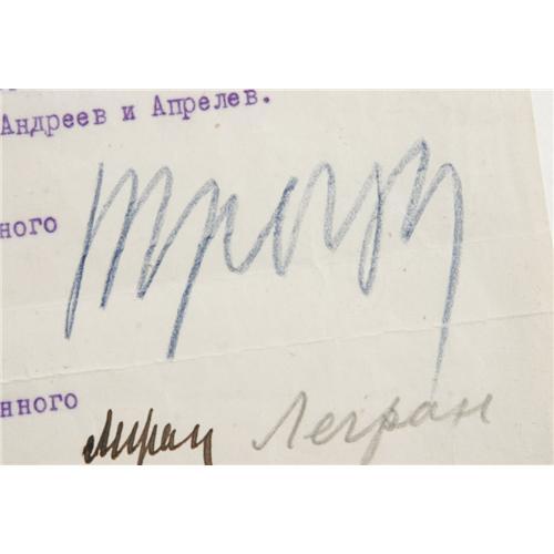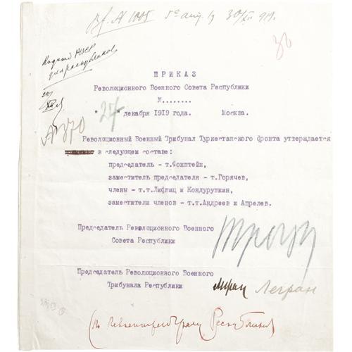 <B>Leon Trotsky Typed Document Signed.</B></I> "<I>Trotsky</B></I>", typed orders issued by the Revolutionary Military Council of the Republic, 8.25" x 9", September 27, 1919, Moscow, in Russian, naming members of the Revolutionary Military Tribunal of the Turkestan Front. The document is fine and housed in a red full Moroccan leather case. In addition to the document there is a photograph of Trotsky.<BR><BR><b>Shipping:</b> Small Collectibles (<a target="_blank" href="http://www.heritageauctions.com/common/shipping.php">view shipping information</a>)