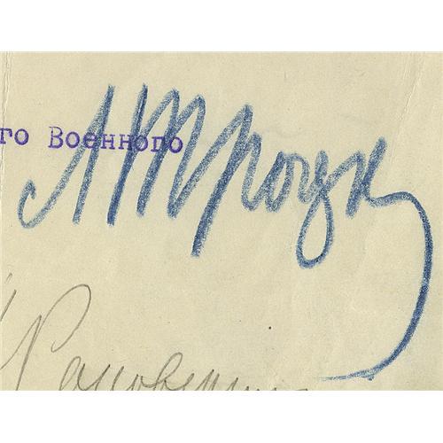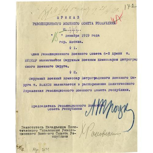 <B> Leon Trotsky Typed Letter Signed </B></I> <I> "L. Trotsky," </B></I> One page, 6.6" x 8.3", Moscow, December 15, 1919. This letter is written on Order of the Revolutionary Military Council of the Republic letterhead. It is a two part military document and reads in part, <I> "…Member of the Revolutionary Military Council of the 6th Army comrade Bitker is hereby appointed the Oktug Military Commissar of the Petrograd Military Okrug…" </B></I> The letter is boldly signed in blue pencil by Trotsky and countersigned by Ch. Rakovsky. Trotsky was a Russian Communist leader who had a political struggle with Stalin was therefore expelled from the party. Trotsky was eventually banished from Russia by Stalin, whereupon he moved to Mexico. He was later killed by an assassin, whom many people believe to have been sent by Stalin himself. <BR><BR> The letter is in very fine condition; usual folds are present; some slight soiling is present on the obverse.