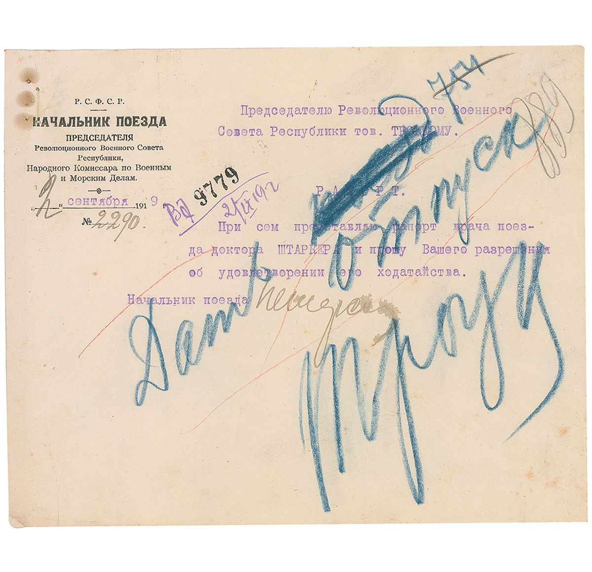 Russian Communist leader (1879–1940) who, with Lenin, organized the Bolshevik seizure of power during the October Revolution of 1917. In 1929, five years after Lenin’s death, Stalin defeated Trotsky for control of the Communist Party and banished him from Russia. Trotsky spent most of the remainder of his life in Mexico, where he was assassinated with a pickaxe by a Stalinist agent. DS in Cyrillic, signed in blue pencil “Trotsky,” one page, 8.5 x 7, September 2, 1919. Document from the Chief of the Train of Crmsr., People’s Commissar of War and Navy Affairs, in full: “The rapport of train’s doctor Shtaker is given and asking Your permission to satisfy this petition,” to which Trotsky responds, “Vacation to be given.” Scattered light creasing, a vertical crease running parallel to the left edge, a few staple marks along the same edge, which is reinforced by a strip of adhesive on the reverse, uniform toning with scattered areas of heavier toning and light spotting, and pencil and ink notations, the latter of which lightly affects the top of the signature, otherwise very good condition.