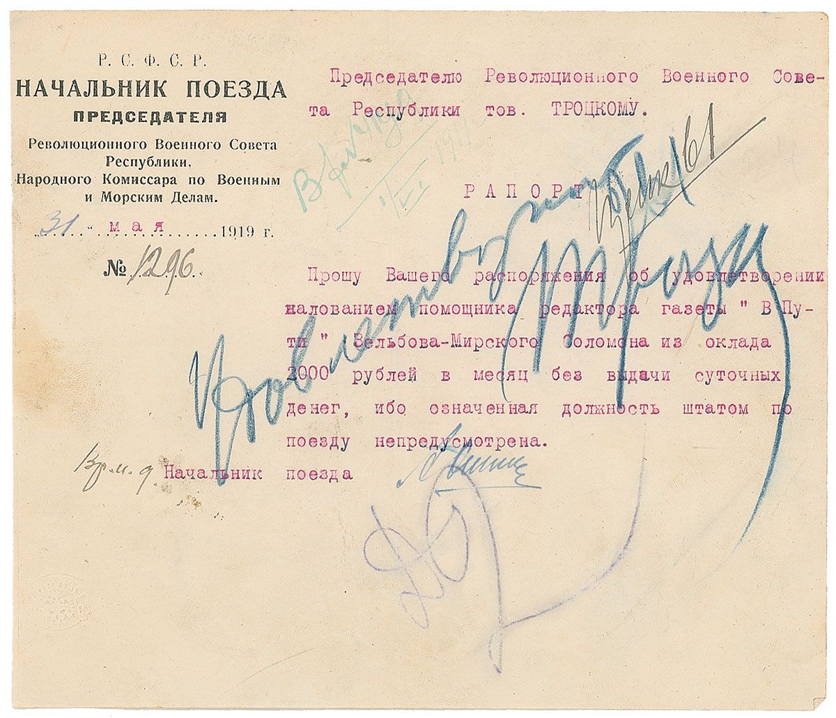 Russian Communist leader (1879–1940) who, with Lenin, organized the Bolshevik seizure of power during the October Revolution of 1917. Bold blue pencil endorsement, signed “Trotsky,” across a one-page request in Russian, one page, 8 x 7, dated May 31, 1919, on People’s Commissar of War and Navy Affairs letterhead. Request reads (translated): “Asking your permission to pay the salary of 2000 rubles to the assistant of publisher of the newspaper ‘On the Way’ comrade Solomon Zelbov-Minsky because this position is not established in staff.” Across the text Trotsky writes (translated): “To be satisfied, Trotsky.” In fine condition, with a vertical fold, some light wrinkles, and expected document wear.
