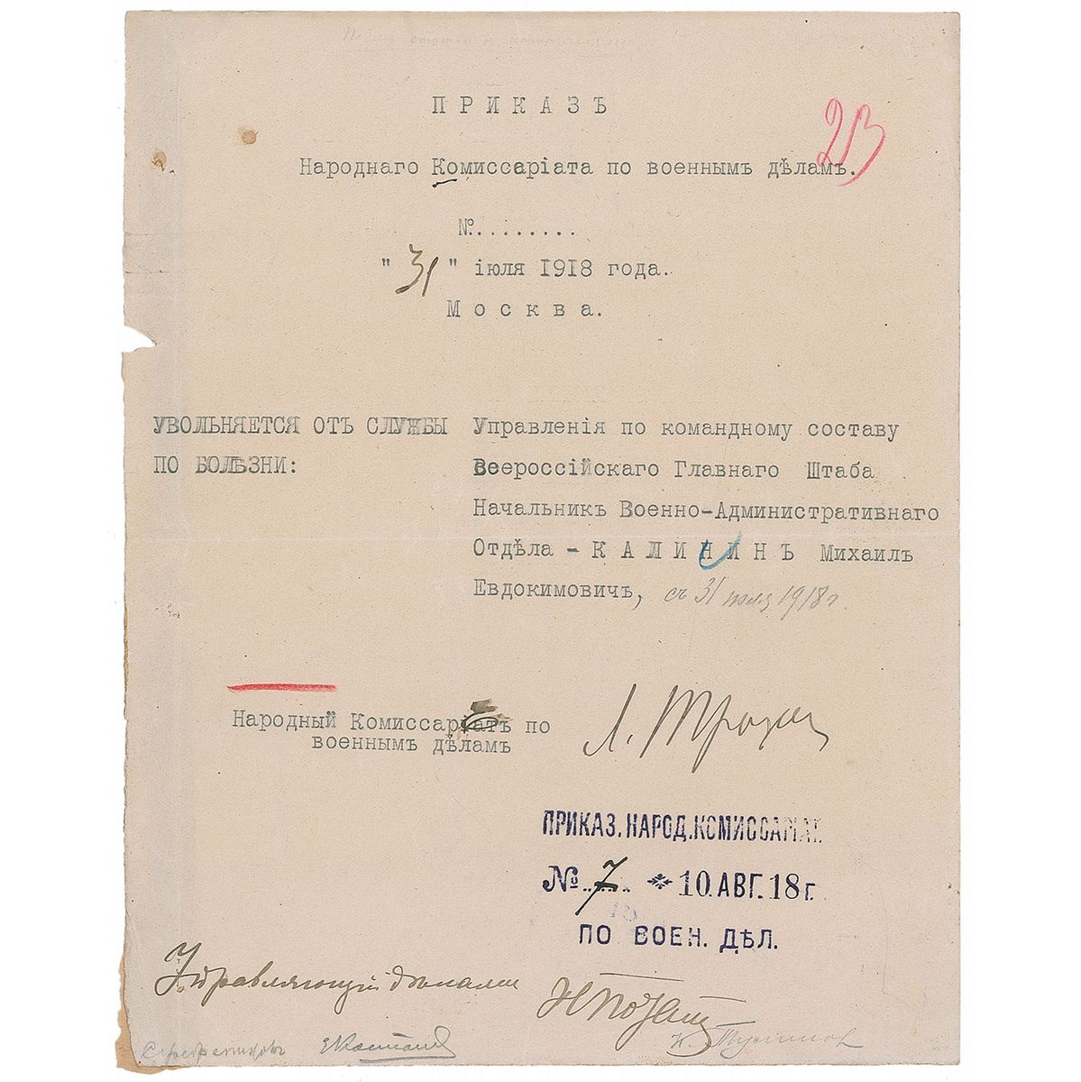 Russian Communist leader (1879–1940) who, with Lenin, organized the Bolshevik seizure of power during the October Revolution of 1917. DS in Russian, signed “L. Trotsky,” one page, 7 x 8.75, 1918. Untranslated document is signed at the conclusion by Trotsky and countersigned by five others. Document also bears an official Russian stamp at the bottom dated April 10, 1918. In very good condition, with a central horizontal fold; several red pencil notations and an office stamp; mounting remnants and slight paper loss to left edge; and a vertical fold along left edge. Only one month earlier, Trotsky was appointed the People's Commissar of Army and Navy Affairs, gaining full control over the army, having to answer only to the Communist Party leadership. During the Russian Civil War over the next several years he transformed the army into a strong and disciplined machine, sometimes using less than scrupulous means.