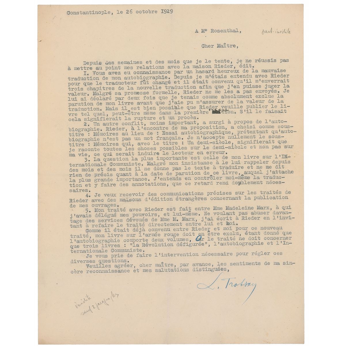 TLS in French, signed “L. Trotsky,” one page, 8.5 x 11, October 26, 1929. Letter to his lawyer in Paris, Gerard Rosenthal, written from Constantinople while living in exile. Trotsky expresses his dissatisfaction with Rieder, the publisher of the French edition of his autobiography, My Life, originally written and published in German. He comments on the poor quality of the translation, complains that the publisher’s subtitle was chosen without his input, and is concerned about the pace at which the work is proceeding, especially with regard to their postponing the publication of his other works. In part (translated): "The most important question is my book on the Communist International that he has yet to translate despite my repeated urgings. I need to know the date of publication of this book, to which I attach the utmost importance.” Trotsky made a few edits to the text in his own hand. In fine condition, with intersecting folds and light overall wrinkling.