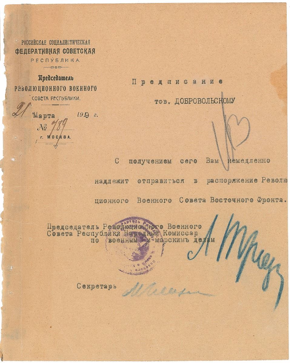 DS in Cyrillic, signed “L. Trotsky,” one page, 7 x 9, March 21, 1919. Decree from the Revolutionary Military Council of the Republic issued to Comrade Dobrovolsky, in full (translated): “By receipt of this document you are immediately to place yourself at the disposal of the Revolutionary Military Council of the Eastern Front.” Signed at the conclusion in blue pencil by Trotsky as the chairman of the Revolutionary Military Council of the Republic and the People’s Commissar for Naval Affairs. In very good to fine condition, with a mounting strip to reverse.
