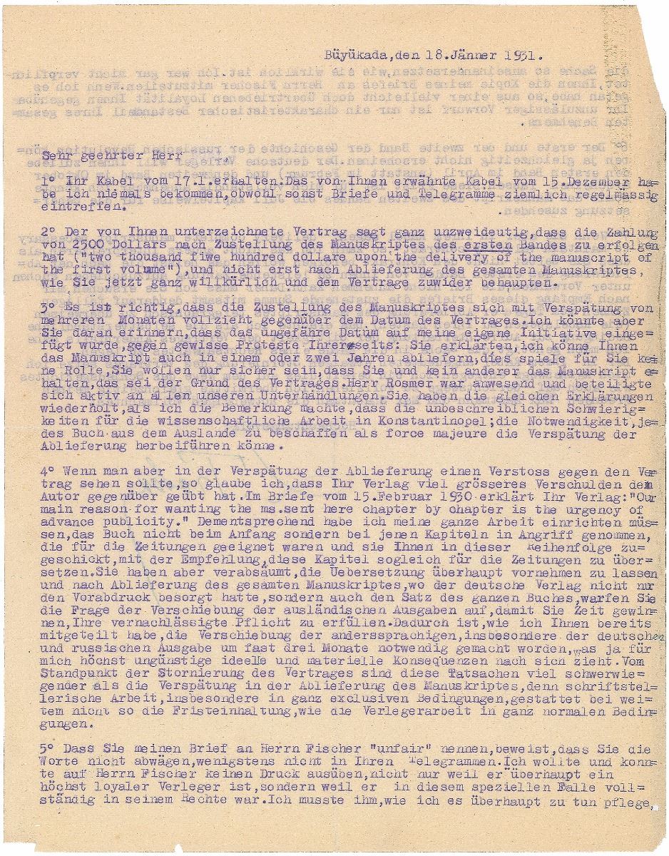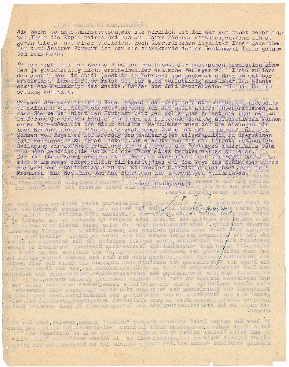 TLS in German, signed “L. Trotsky,” one page both sides, 8.5 x 11, January 18, 1931. Letter to a publisher concerning the contract and delivery time for the manuscript of his work History of the Russian Revolution. In part (translated): "The contract signed by you undoubtedly states that the payment of $2500 will follow after delivery of the first volume of the Manuscript and not after delivery of the complete Manuscript, as you now arbitrarily maintain and is contrary to your agreement…It is correct that the delivery of the Manuscripts runs several months later than the date of the contract. I would like to remind you that the approximate date was added on my own initiative, against certain protests on your part. You explained that I could deliver the Manuscripts to you in one or two years, that it would not matter to you; you only wanted to be assured that you and no one else would receive the Manuscripts…If one sees an offense in the delay of the delivery against the contract, I believe that your publishing house is guilty of an even larger offense towards the Author…Your publishing house stated: ‘Our main reason for wanting the ms. sent here chapter by chapter is the urgency of advance publicity.’ Accordingly, I had to arrange my entire work not at the beginning of the book, but with those chapters suitable for Newspapers…But you have neglected to even undertake the translation, and after delivery of the entire Manuscript…you raised the question of postponing the foreign publications so that you could gain time to fulfill your neglected obligation. Therefore, I have already informed you of the delay of about 3 months for the foreign versions, especially of the German and Russian editions, which has for me the most unfavorable consequences, intellectually and materially…The literary work, especially under very exclusive conditions, does not allow by far to fix a term as to publishing under normal conditions…The first and second volumes of the History of the Russian Revolution cannot appear simultaneously. The German publisher, so as to please you, will bring out the first volume in April (instead of February) and the second volume in October…But if you state in your cable: ‘delivery complete manuscript necessary to maintain validity contract,’ I cannot interpret it any differently but take it that you yourself do not want to comply with the contract, which means that you are trying to postpone your payments until after delivery of the first volume under pretexts that I cannot accept.” In fine condition, with a small tear to the right edge, and slight paper loss to the upper right corner. The initial edition of Trotsky’s History of the Russian Revolution appeared in three volumes in Russian in 1930, and was then translated to English by Max Eastman and released in 1932. An important historical work, Eastman wrote that it would ‘take its place in the record of Trotsky's life... as one of the supreme achievements of this versatile and powerful mind and will.’