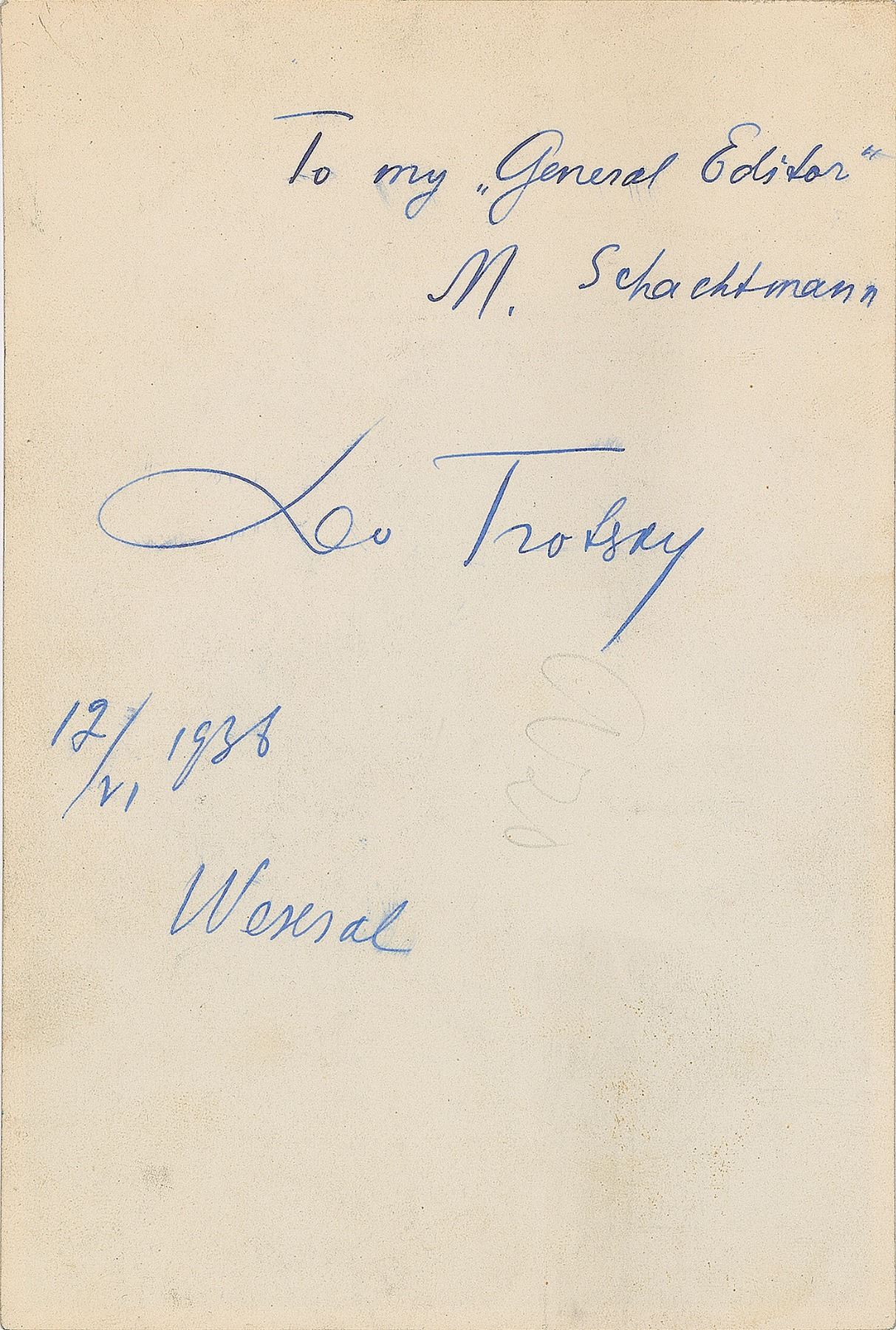 Vintage matte-finish 4 x 5.75 half-length photo of Trotsky posing outside, signed and inscribed on the reverse in blue fountain pen, "To my General Editor, M. Schachtmann, Leo Trotsky, 12/VI 1938.” In fine condition. Exiled from the Soviet Union, Trotsky arrived in Mexico in January 1937 and took refuge in the home of Rivera and Frida Kahlo, where he lived until April 1939; he is also portrayed in one of Rivera's murals along with Marx and Engels. Trotsky remains rare in signed photos.
