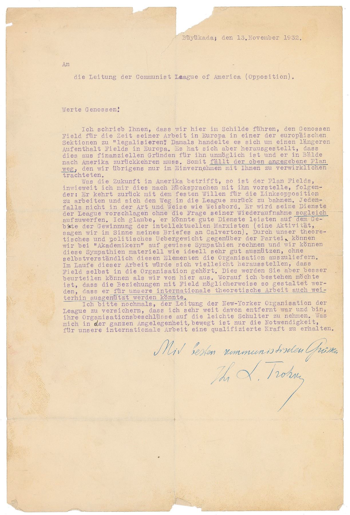 TLS in German, signed “With best communist regards, Thr. L. Trotsky,” one page, 8.75 x 13, November 13, 1932. Letter addressed to "The Leadership of the Communist League of America (Opposition), in full (translated): "I wrote to you about our intention to 'legalize' comrade Field in one of our European sections for the duration of his work in Europe. At the time we anticipated a longer stay in Europe; but for financial reasons, that turned out to be impossible, and he has to return to America rather soon. That cancels our aforementioned plan which, in any case, would not have been executed without your consent. With regard to his future in America, Field's plans, as far as I understood them after talking with him, are as follows: He will return with the best intention to work for the left wing opposition and to regain entry into the League. But, to be sure, not in the way Weisbord did. He will offer his services to the League without immediately attempting to renew his membership. I think he could render valuable services in attracting the intellectual Marxists (an activity, let's say in the sense as laid out in my letter to Calverton). Because of our theoretical and political predominance against the party, we can expect a certain sympathy from the 'academicians,' and this sympathy could well be exploited to our advantage in a material as well ideal sense, without, however, handing over the organization to those elements. In working that way, Field might prove to belong to the organization himself, but you will be better able to judge that than we would from here. But I should insist that the relation to Field will be such that he can be further utilized in our international theoretical work. Again I should like to assure the leadership of the New York organization that I was, and still am, far from taking easy the decisions of your organization. What guides me in the whole matter is the necessity to preserve such a qualified man for our international work." Trotsky has underlined a few sentences of the letter. In very good to fine condition, with some light staining, and areas of paper loss to the edges.