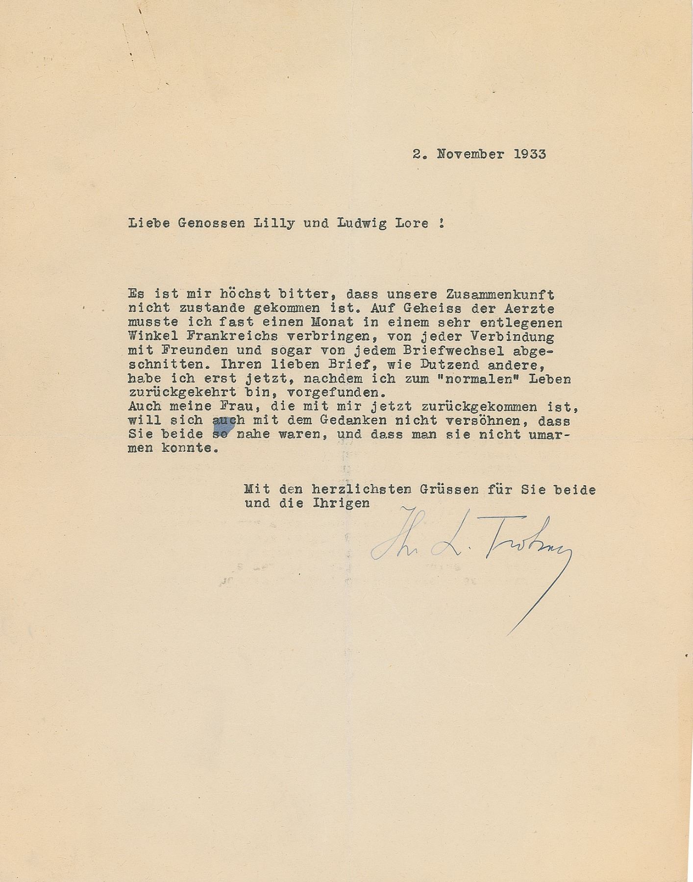TLS in German, signed “Ihr L. Trotsky,” one page, 8.25 x 10.75, November 2, 1933. Letter to Lilly and Ludwig Lore, in part (translated): "I am disappointed that our meeting is not concluded. At the behest of the doctors I had almost a month in a very remote corner of France, cut off from each connection. Your kind letter, as dozens of others, I have only now found after I returned to 'normal' life. Even my wife who has come back to me now, will not reconcile herself with the thought that you were both so close." In very good to fine condition, with scattered light creasing and wrinkling, and a rusty paperclip impression to the top edge.