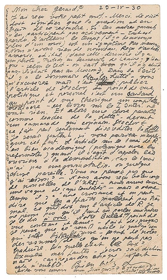 ALS signed "L," one page on a plain 3.5 x 6.25 postcard addressed in his hand, April 29, 1930. Trotsky writes from Turkey to his friend and Paris lawyer, Gerard Rosenthal, in Paris. In part (translated): "I received others [letters] American and Italian; in the latter there is a picture 'Trotsky at Lenin's funeral'—even though according to the text—one sees that he was not there—he was not in Moscow…From a political and personal standpoint he is a bastard…The article on May 1st from R. is quite academic (polemic with the reformers) when it comes to calling the workers to the demonstration because May 1st is not a Stalin day or something like this. Don't you think that I am right? We have received a lot of news from USSR. We have a wave of 'partisans' but at the same time there is a growth and one can say that things are not doing too bad, it is what was said in R's article." In fine condition, with a crease to the lower right corner, above the signature.