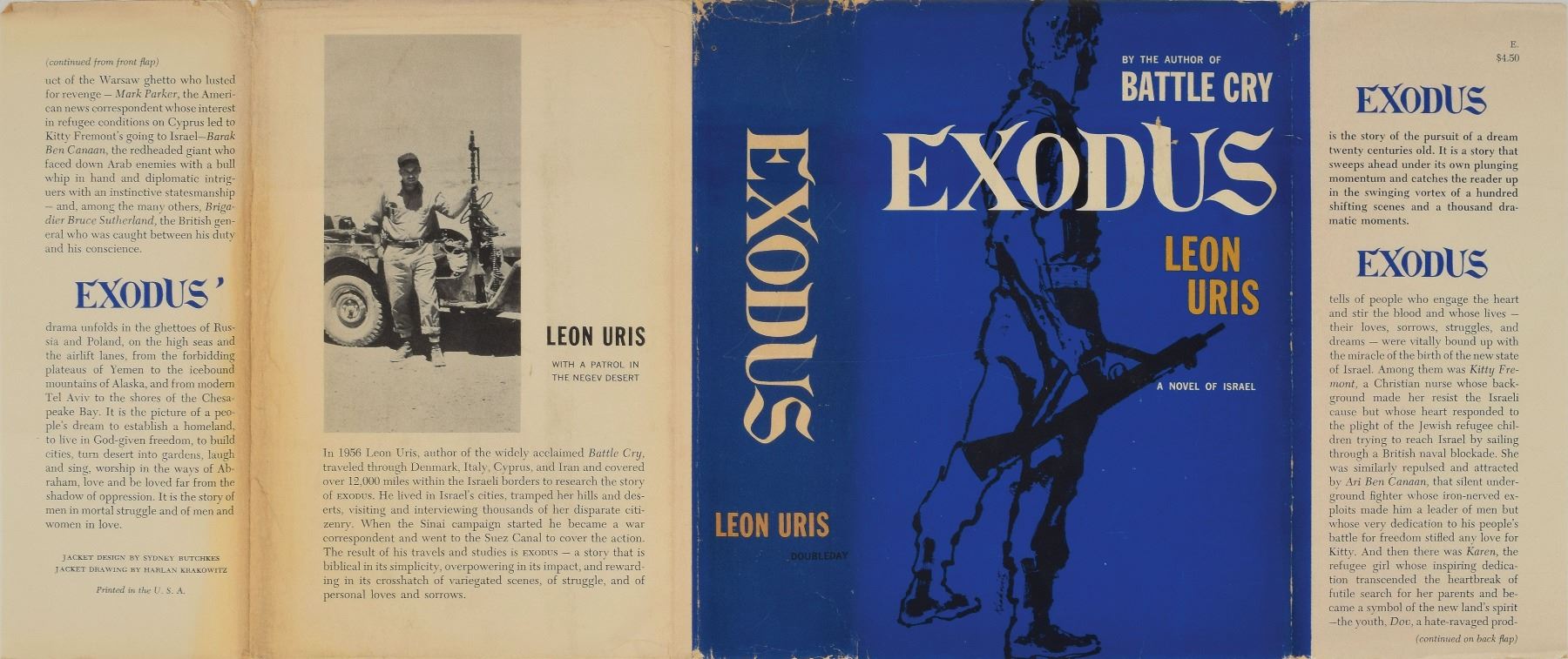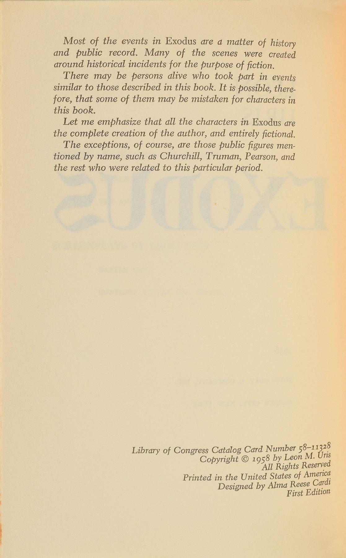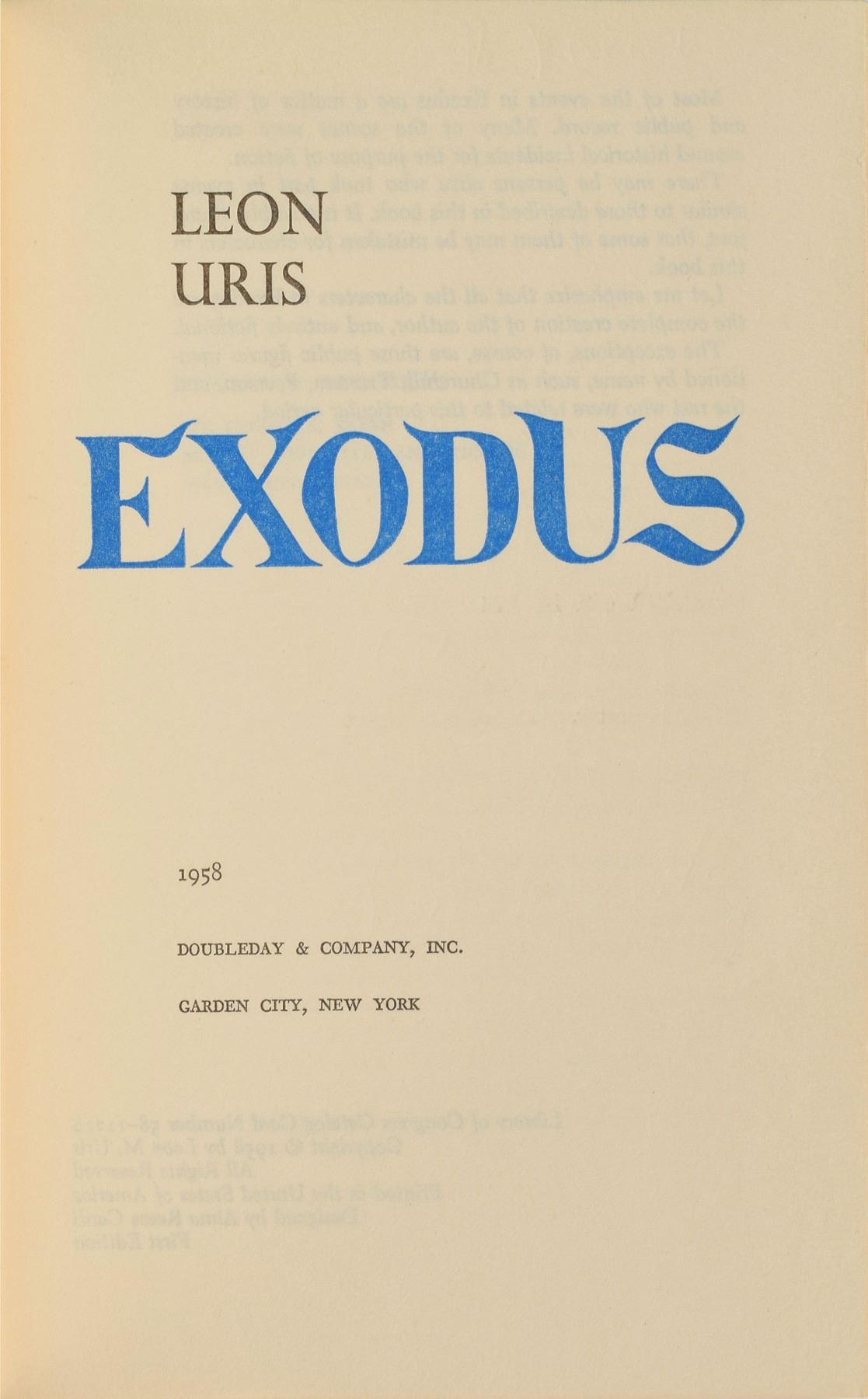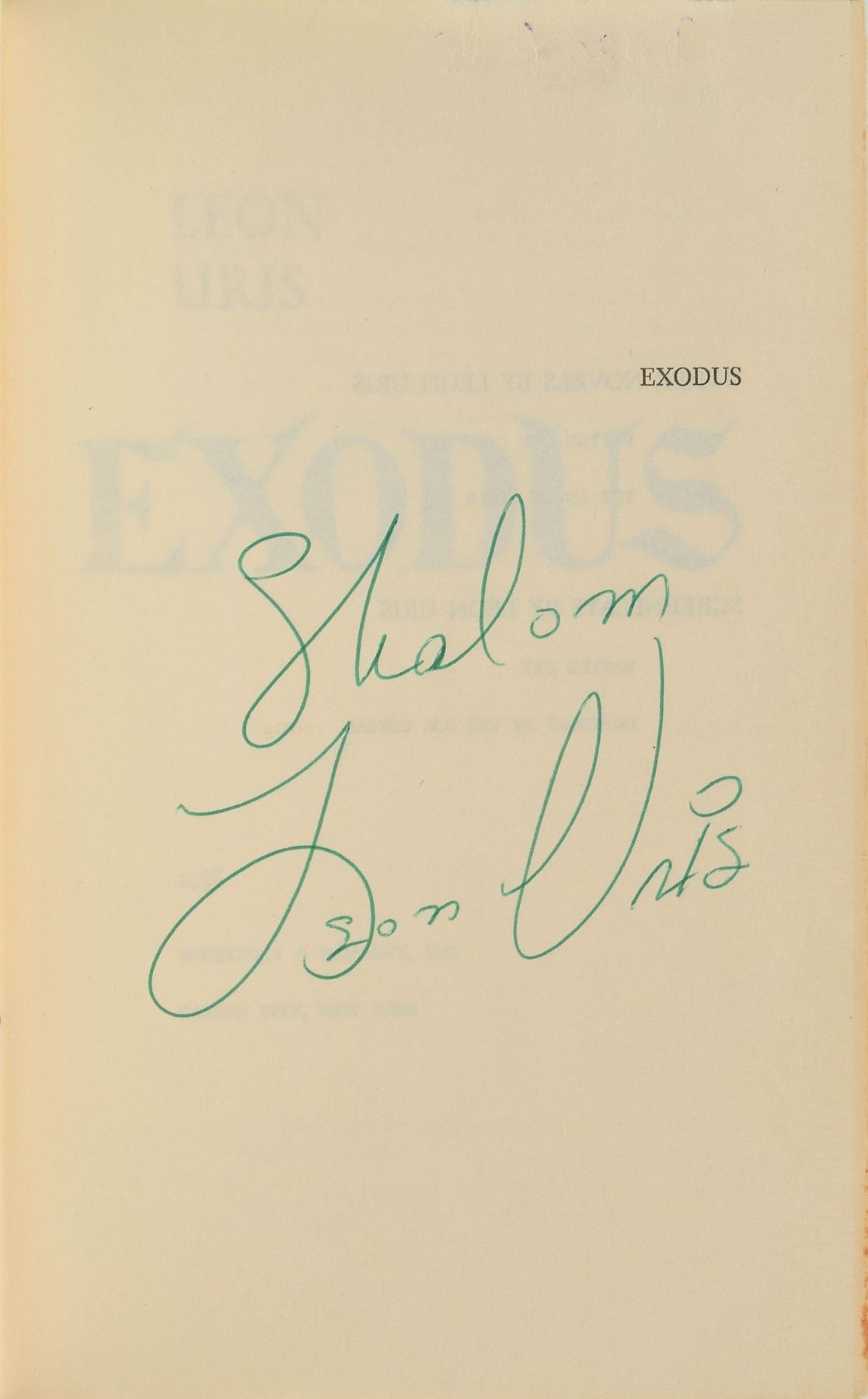 Signed book: Exodus. First edition. Garden City, NY: Doubleday, 1958. Hardcover with dust jacket, 6 x 8.5, 626 pages. Signed on the half-title page in green ballpoint, "Shalom, Leon Uris." Autographic condition: fine, with the removal of an ownership inscription from the top of the signed page. Book condition: VG/VG, with small edge tears to dust jacket.