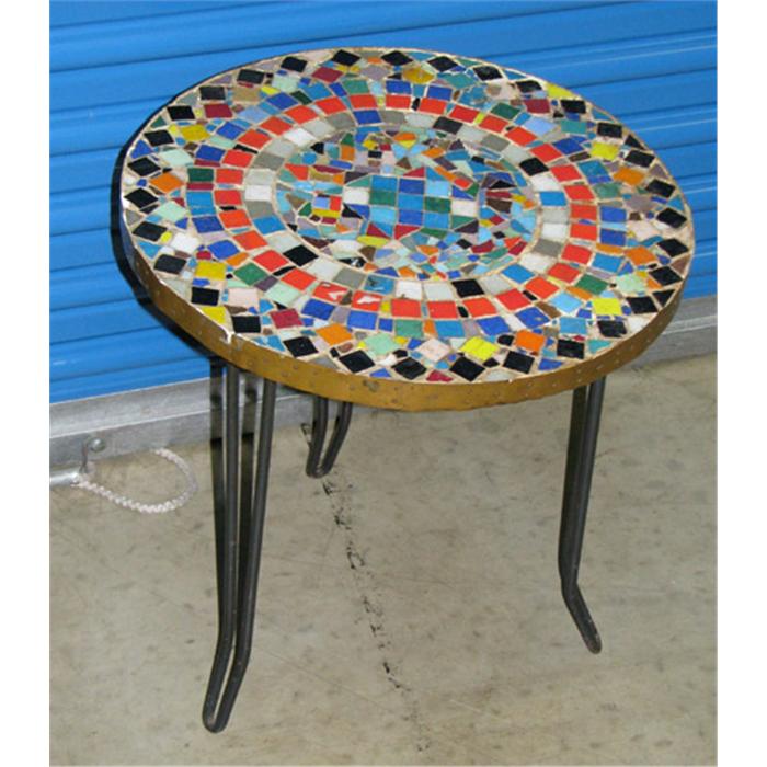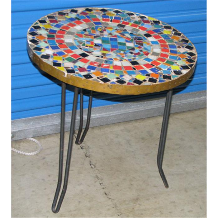 Title: Mid Century Modern Mosaic Wire Table with Brass Edge and Round Top, colorful tiles