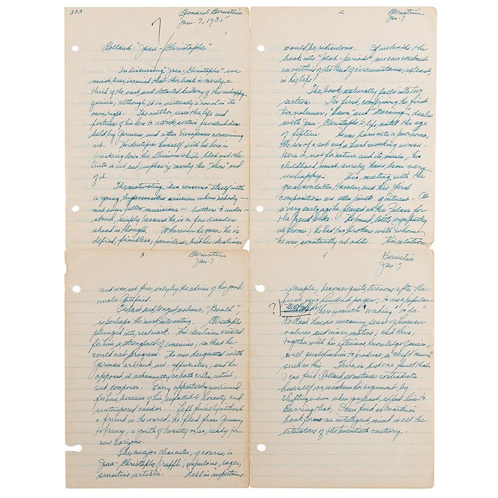 AMS signed "Leonard Bernstein" (once) and "Bernstein" (three times), seven pages on four sheets, 6.5 x 8.5, January 7, 1935. Handwritten essay by Leonard Bernstein entitled "Rolland: Jean-Christophe," penned while a freshman at Harvard. Romain Rolland's ten-volume novel centers on Jean-Christophe Krafft, a composer of genius whose life is depicted from cradle to grave—a fascinating topic for the young Bernstein to explore. He notes, in part: "'Jean-Christophe' is my favorite book. It has every reason to be. Primarily, it harmonizes with my tastes and offers a character which I can understand and sympathize with. Secondly, the book is incomparably well written. The word-pictures and dissertations never tire one—a rare thing for long books…Rolland has an uncanny sense of human values and inner motives; and this, together with his extensive knowledge of music, well qualifies him to produce a 'chef d'oeuvre' such as this." In fine condition.