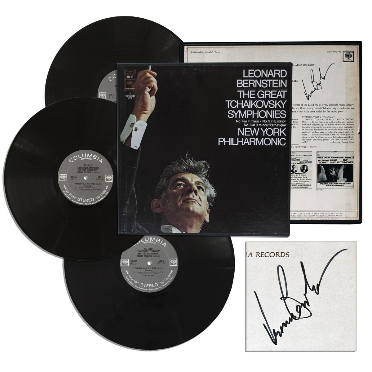 Conductor Leonard Bernstein signed boxed set of ''The Great Tchaikovsky Symphonies'', performed by the New York Philharmonic and released on Columbia Records. Bernstein signs his full name, ''Leonard Bernstein'' in black felt tip on the rear panel. Boxed set measures 12.5'' x 12.5''. All three first press vinyl records are housed in their original sleeves. Bumping to corners and shelf wear, else fine.