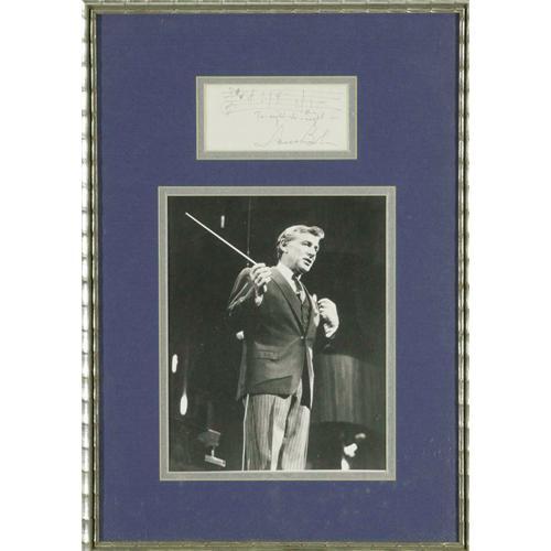 <B>Leonard Bernstein Signed Music Quote with Photograph.</B></I> A composer, conductor, and educator, Leonard Bernstein was one of a handful of figures in the 20th century who truly changed the face of music. Bernstein's legacy includes three symphonies, a film score of singular distinction, "On the Town," and an important body of stage works that includes a cornerstone of American musical theater, "West Side Story." This lot features a handwritten music quote (along with the lyrics for "Tonight" from "West Side Story") signed by Bernstein, framed and matted along with a photo of the legendary composer. <I>With COA from PSA/DNA.</B></I>