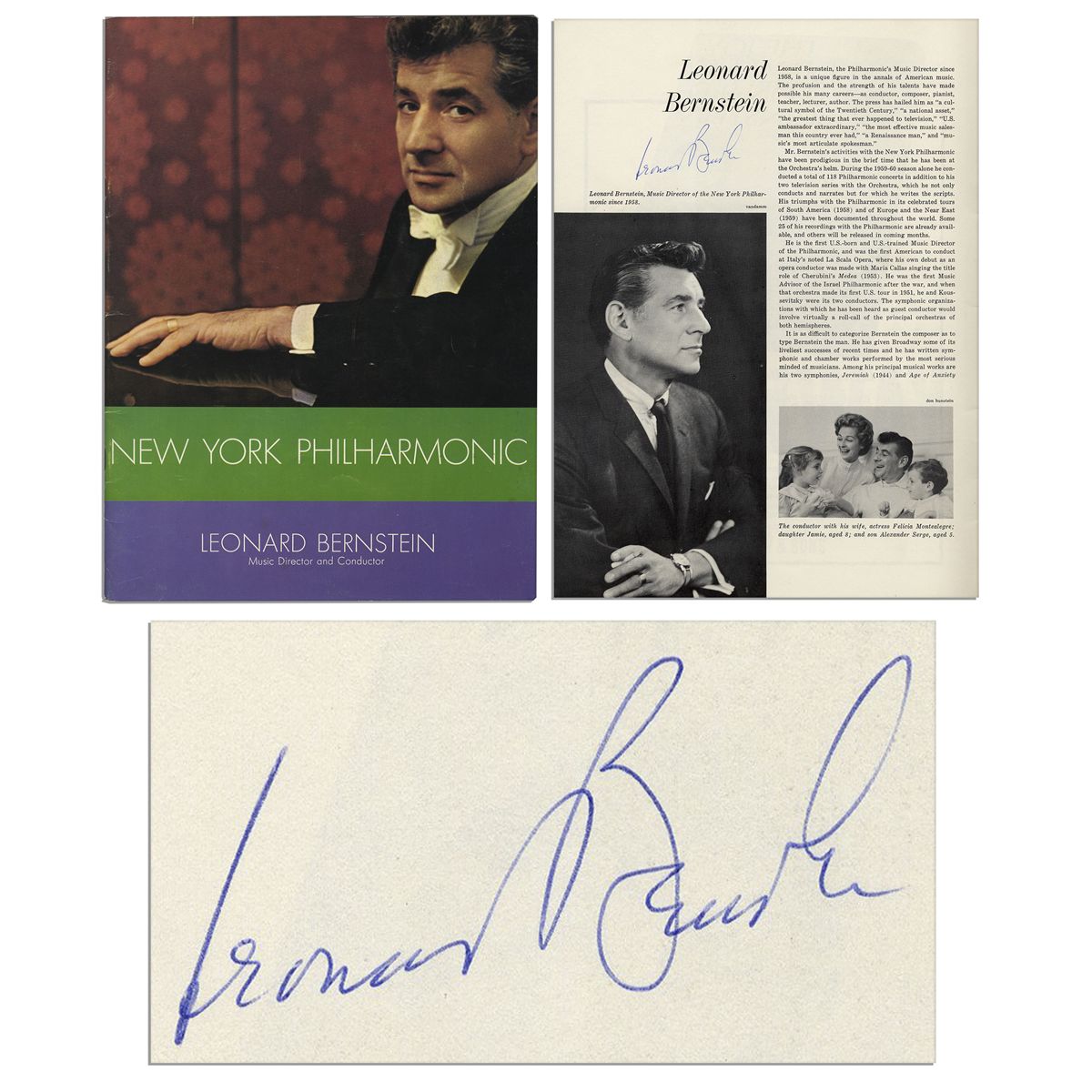 Leonard Bernstein signed New York Philharmonic program from 1960. The legendary conductor signs ''Leonard Bernstein'' in blue ink on the first page of the article about him. Unpaginated program runs 24pp. Photo-illustrated in black and white and soft-bound in color. Measures 9'' x 12''. Faint creasing to cover and wear to edges. Near fine.