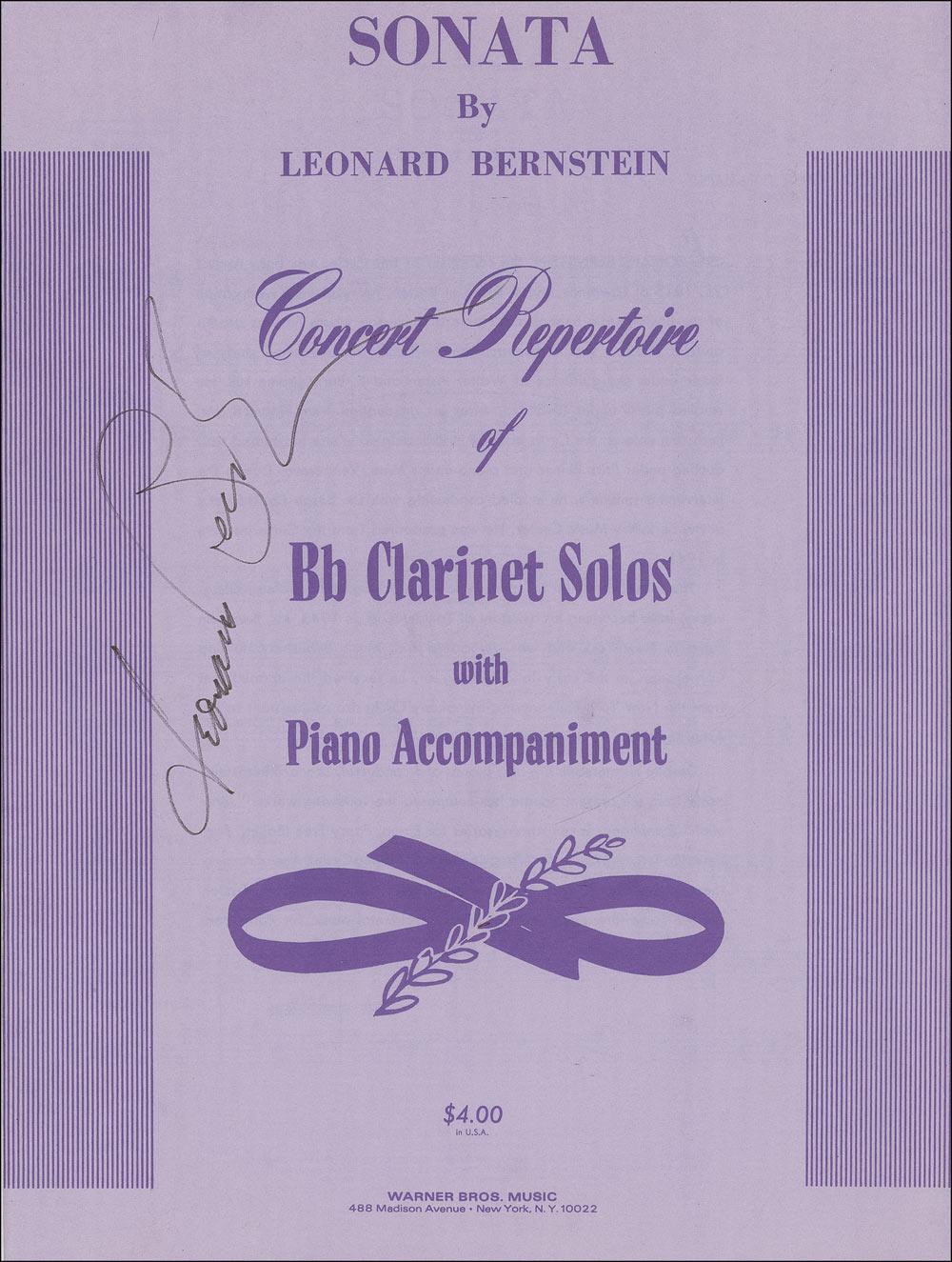 Sheet music for “Sonata” by Leonard Bernstein, 9 x 12, 20 pages, signed vertically in black ink on the front cover. In fine condition.