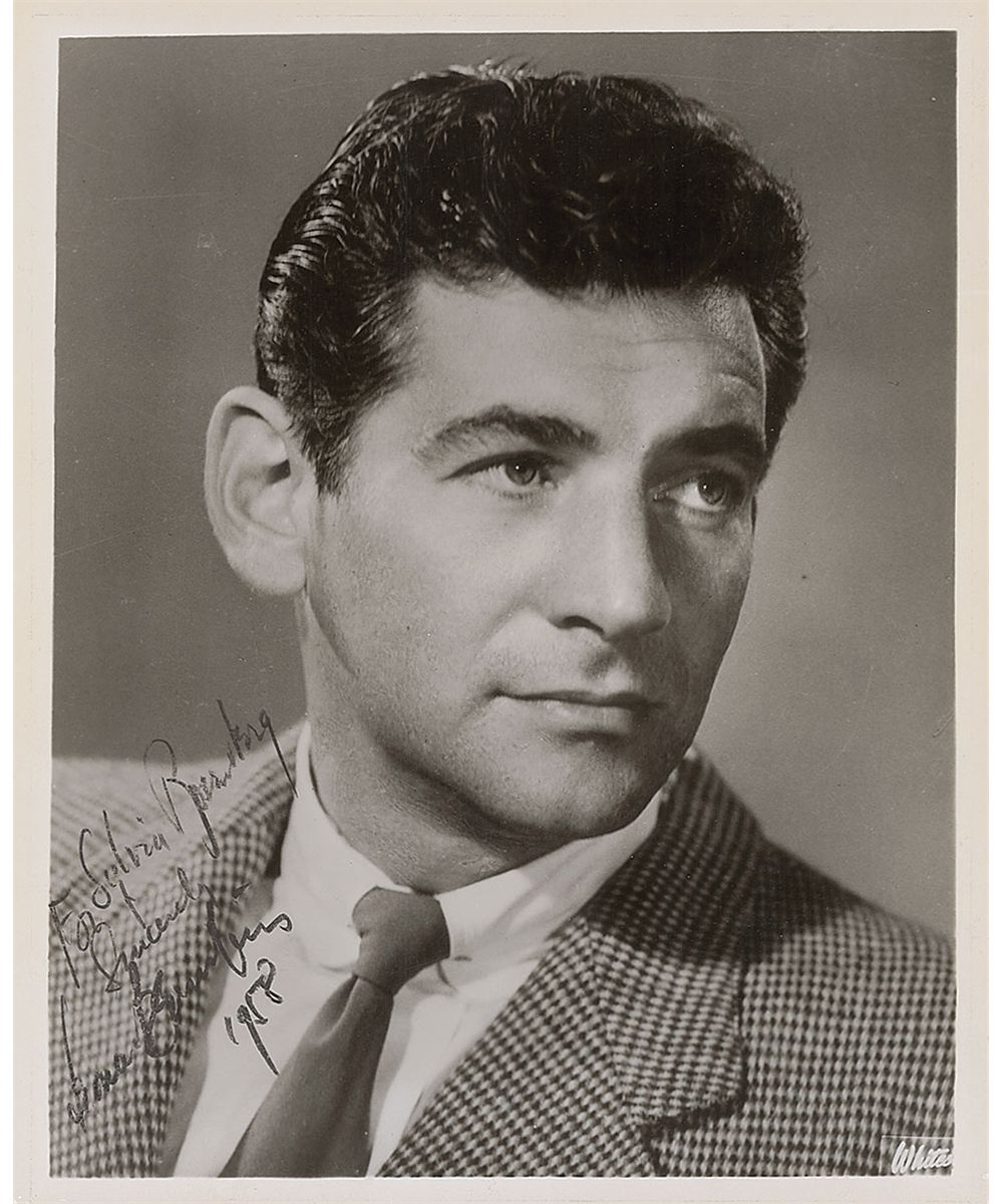 Early vintage glossy 8 x 10 head-and-shoulders photo, signed and inscribed in black pencil “For Sylvia Rosenberg, Sincerely, Leonard Bernstein 1958.” Some scattered surface marks and creases, and some light contrast to portions of signature, otherwise fine condition.