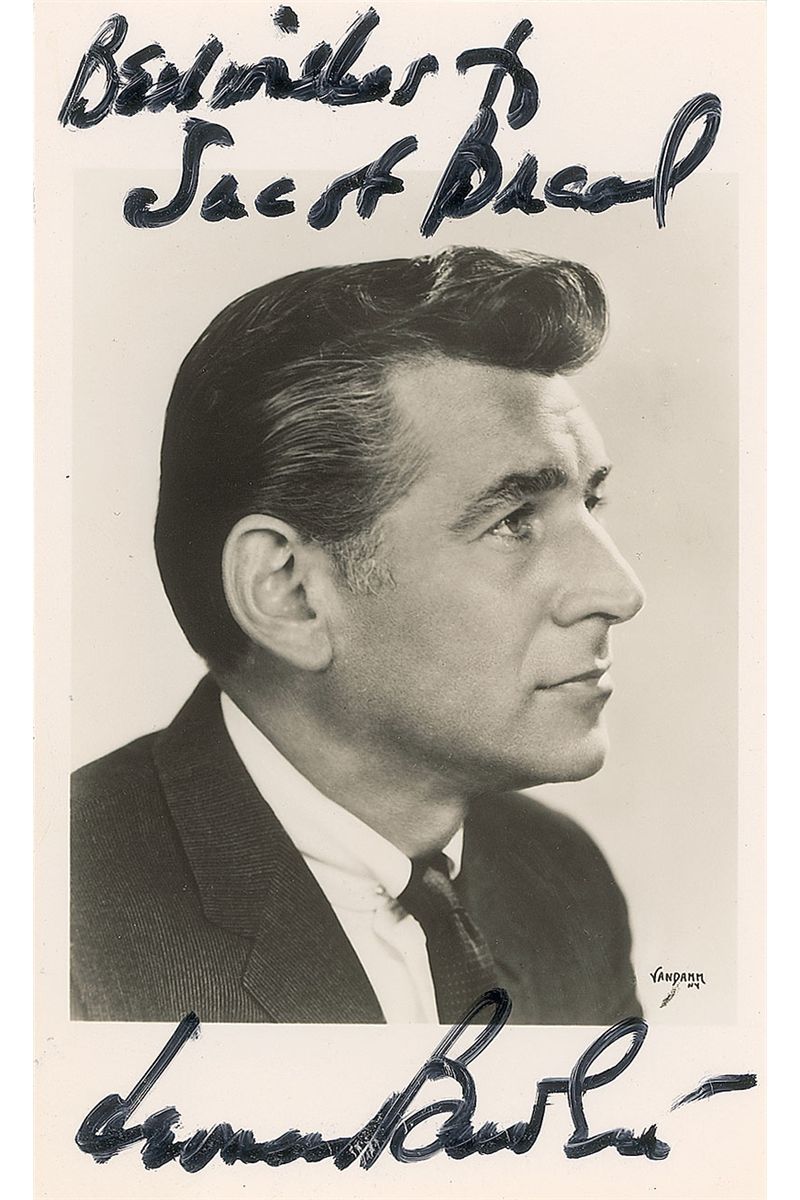 Glossy 3.25 x 5.5 photo of a young Bernstein, signed and inscribed in black felt tip, “Best wishes to Jacob Bacal, Leonard Bernstein.” In fine condition.