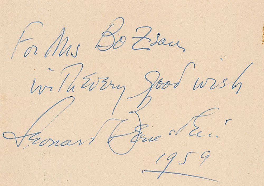 Vintage ballpoint signature and inscription, “For Mrs. Bozsan, with every good wish, Leonard Bernstein 1959,” on an off-white 3 x 2.25 card. In fine condition.