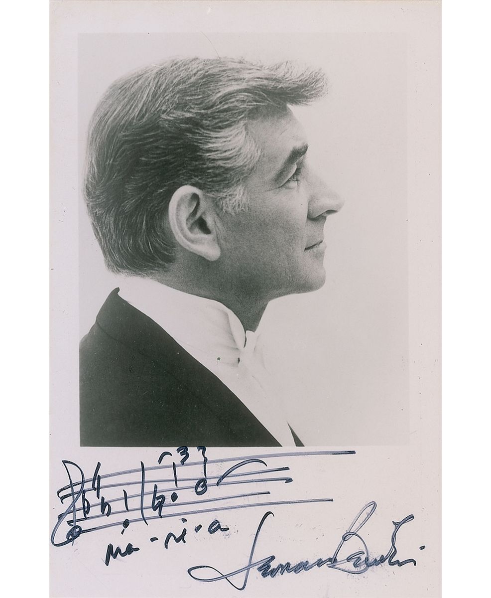 Glossy 3.25 x 5.5 portrait of the composer in profile, signed in the lower border in black felt tip by Bernstein, who adds a two-bar musical quote from the classic West Side Story, penning the lyrics below, “Ma-ri-a.” In fine condition, with trivial surface impressions.