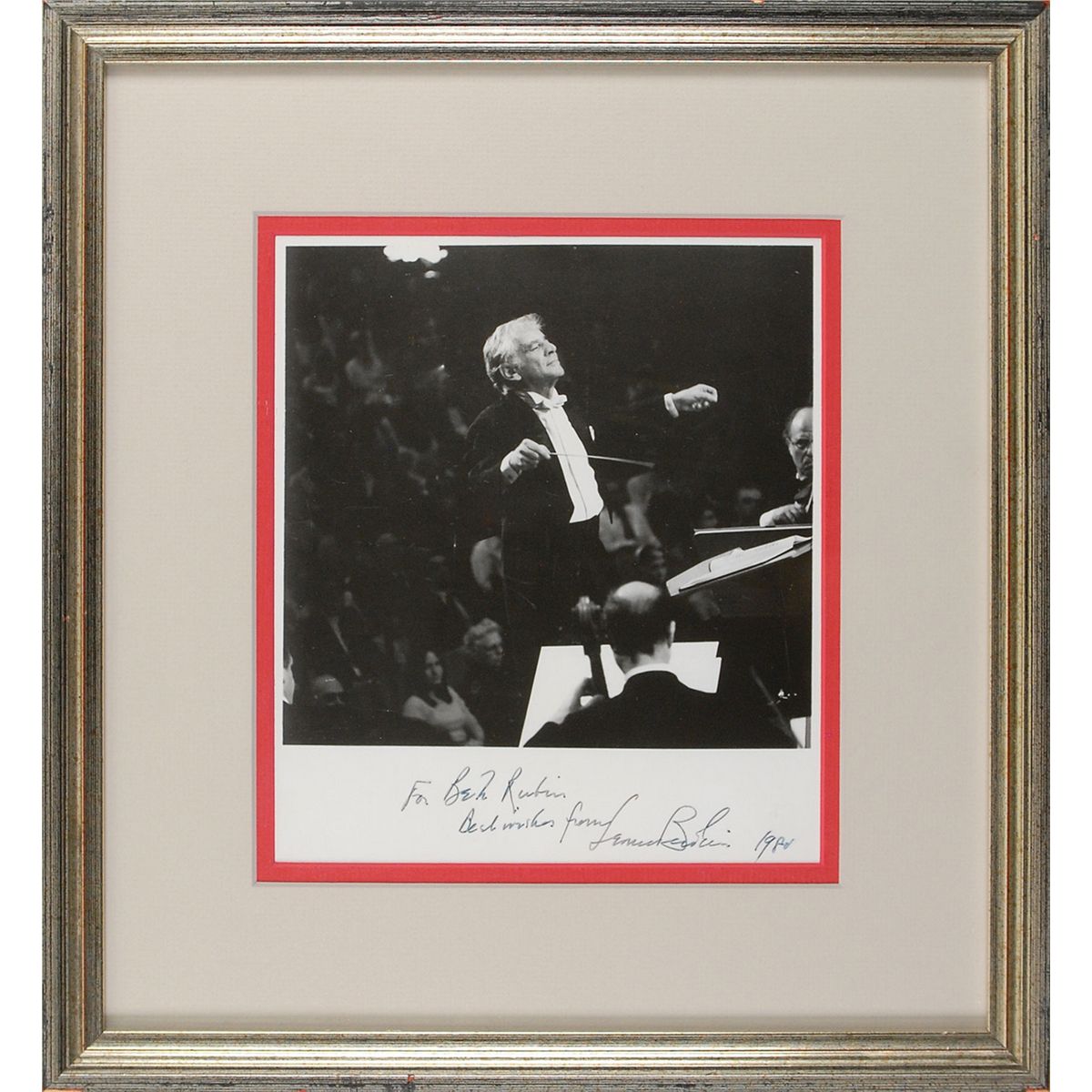 Glossy 7.5 x 8.75 photo of the great conductor, signed and inscribed in black felt tip, “For Beth Rubin, Best wishes from Leonard Bernstein, 1980.” Double-matted and framed to an overall size of 14 x 15. A bit of brushing and irregular adhesion to ink, otherwise fine condition.