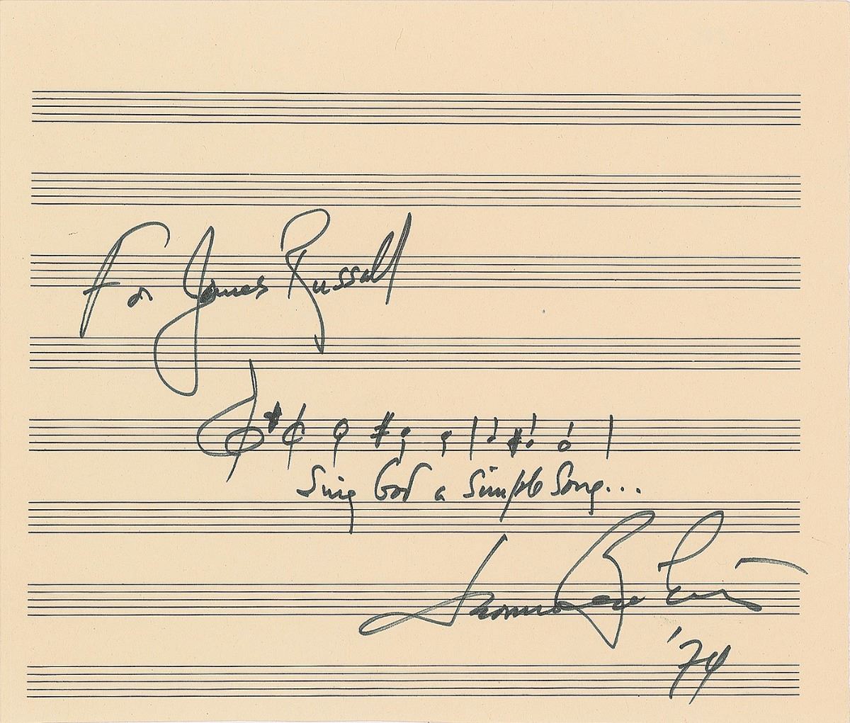 AMQS on an off-white 9 x 7.75 musically lined sheet, signed and inscribed in black felt tip, "For James Russell, Leonard Bernstein, '74." Bernstein pens two bars from 'A Simple Song,' the second movement from his 1971 work Mass, adding the lyrics below, "Sing God a Simple Song..." In fine condition. Pre-certified PSA/DNA.