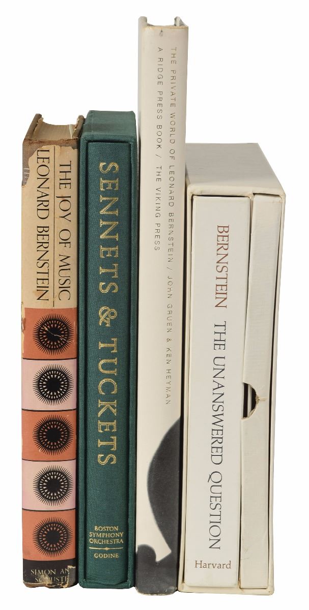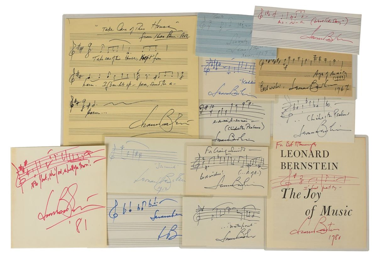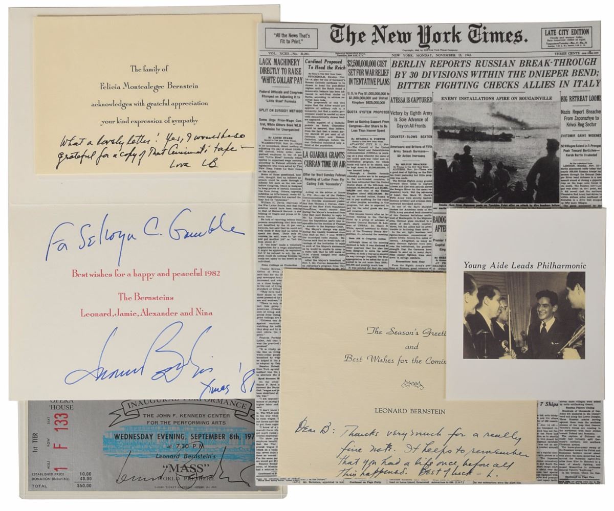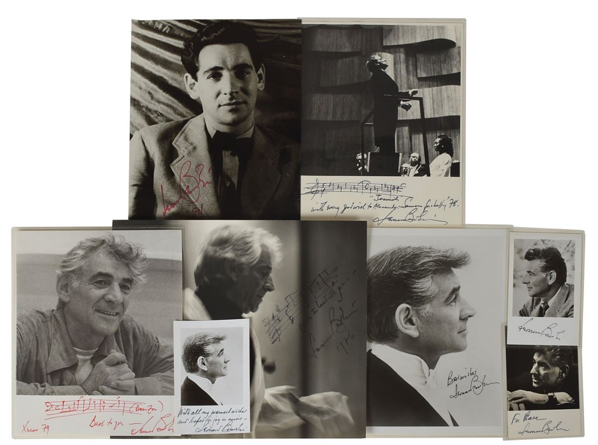 Other items signed by Bernstein include six additional photos of various sizes, eight scores and sheet music booklets, six playbills and programs, four books, two holiday cards, a letter mentioning “my Bach program on Omnibus,” a mourning acknowledgment card following the death of his wife, a ticket to the world premiere of Mass, and two souvenir typescripts. Among the other autographed items in the collection are signed photos of Dimitri Mitropoulos and Artur Rodzinski, an artist’s drawing signed by Bruno Walter, a letter by Bernstein’s father Samuel Bernstein, a souvenir typescript signed by Stephen Sondheim, an AQS by Stephen Wadsworth, and a couple items signed by Adolph Green and Betty Comden. Many of the items are removably encapsulated in archival mylar. In overall fine condition. A complete list is available online at RRAuction.com. 2018 will mark the centenary of Leonard Bernstein's birth. Many concerts and exhibitions are in the planning stages, and this archive would be a significant contribution to any exhibit.