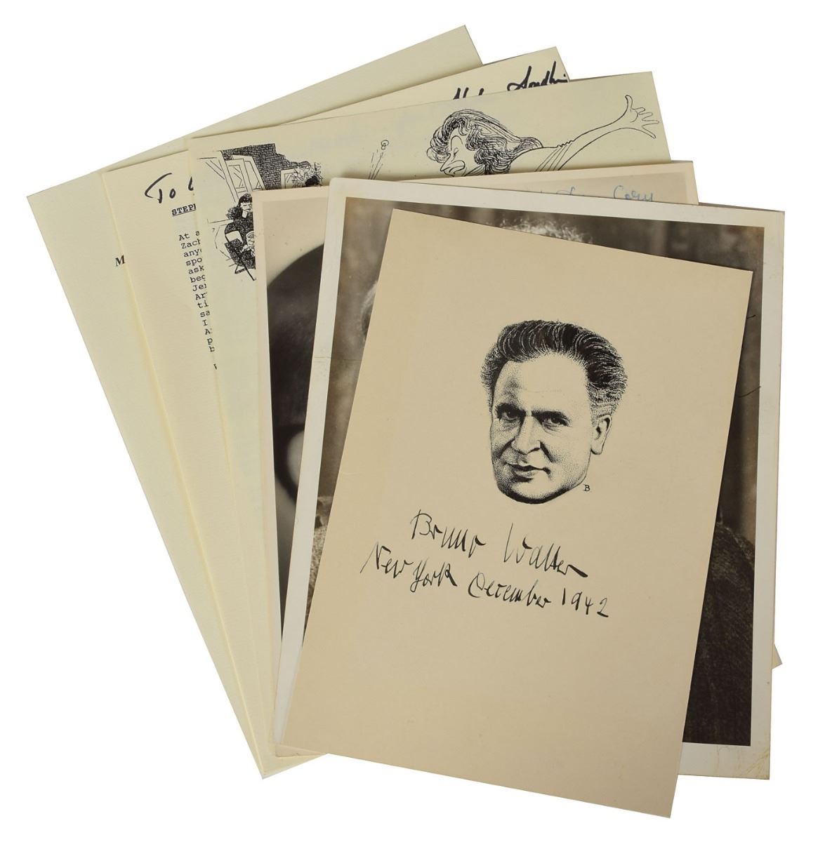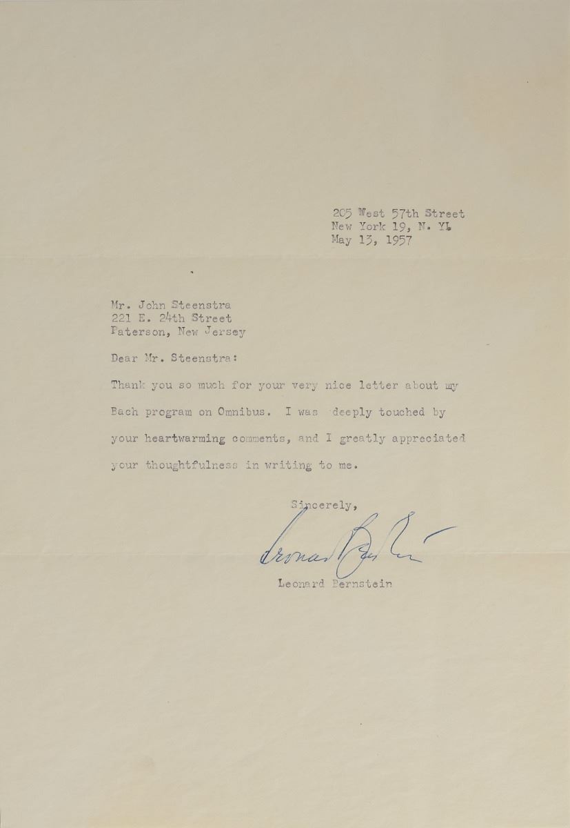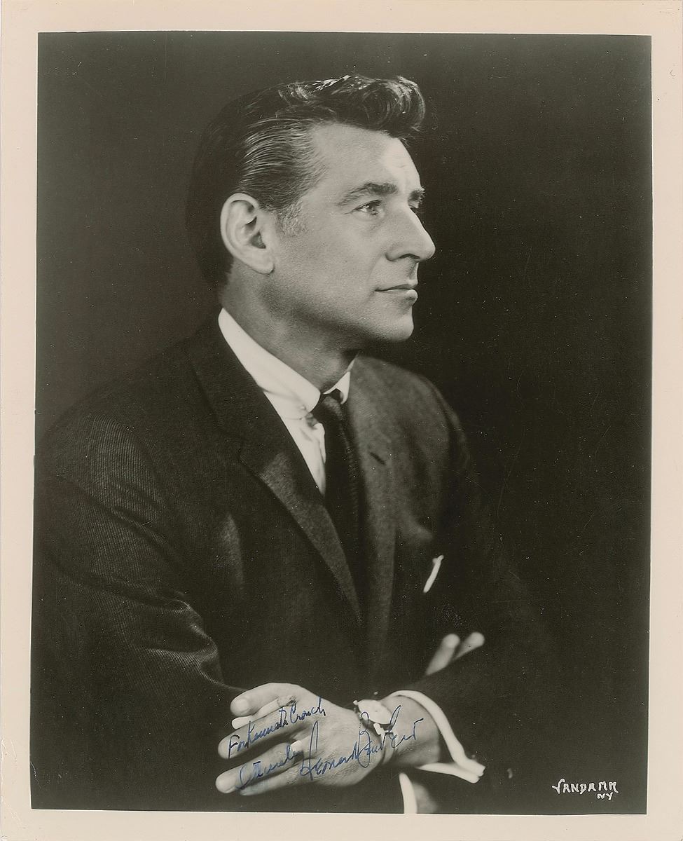 Other items signed by Bernstein include six additional photos of various sizes, eight scores and sheet music booklets, six playbills and programs, four books, two holiday cards, a letter mentioning “my Bach program on Omnibus,” a mourning acknowledgment card following the death of his wife, a ticket to the world premiere of Mass, and two souvenir typescripts. Among the other autographed items in the collection are signed photos of Dimitri Mitropoulos and Artur Rodzinski, an artist’s drawing signed by Bruno Walter, a letter by Bernstein’s father Samuel Bernstein, a souvenir typescript signed by Stephen Sondheim, an AQS by Stephen Wadsworth, and a couple items signed by Adolph Green and Betty Comden. Many of the items are removably encapsulated in archival mylar. In overall fine condition. A complete list is available online at RRAuction.com. 2018 will mark the centenary of Leonard Bernstein's birth. Many concerts and exhibitions are in the planning stages, and this archive would be a significant contribution to any exhibit.