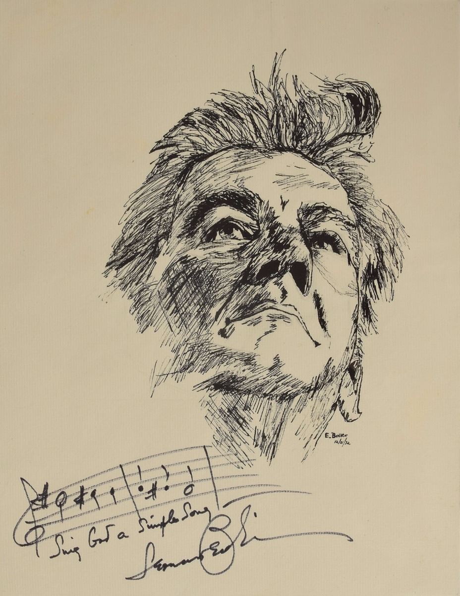 Three photos of Bernstein signed with AMQSs: a fantastic 8 x 10 photo of Bernstein conducting, signed and inscribed with three bars from the first movement ‘Prophecy’ of Jeremiah; an 8 x 10 portrait featuring three bars from the ‘danzon’ of Fancy Free; and a 12 x 10.5 photo featuring three bars of music and lyrics from ‘Music I Heard With You.’ Also includes an original artist’s ink sketch on a 9 x 12 sheet, signed by Bernstein with two bars of music and lyrics from the hymn 'A Simple Song’ from Mass.
