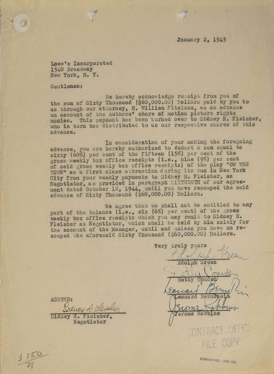 Two documents: a contract for the motion picture rights to On the Town, January 2, 1945, signed by Leonard Bernstein, Adolph Green, Betty Comden, and Jerome Robbins; and a 1954 contract concerning royalties for Wonderful Town, signed by Bernstein, Green, and Comden.