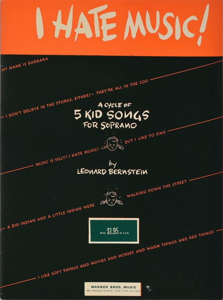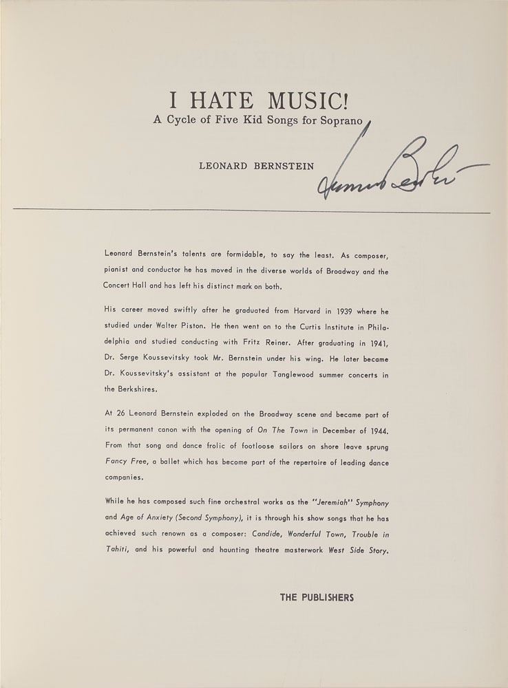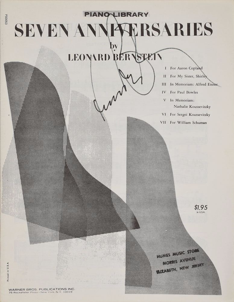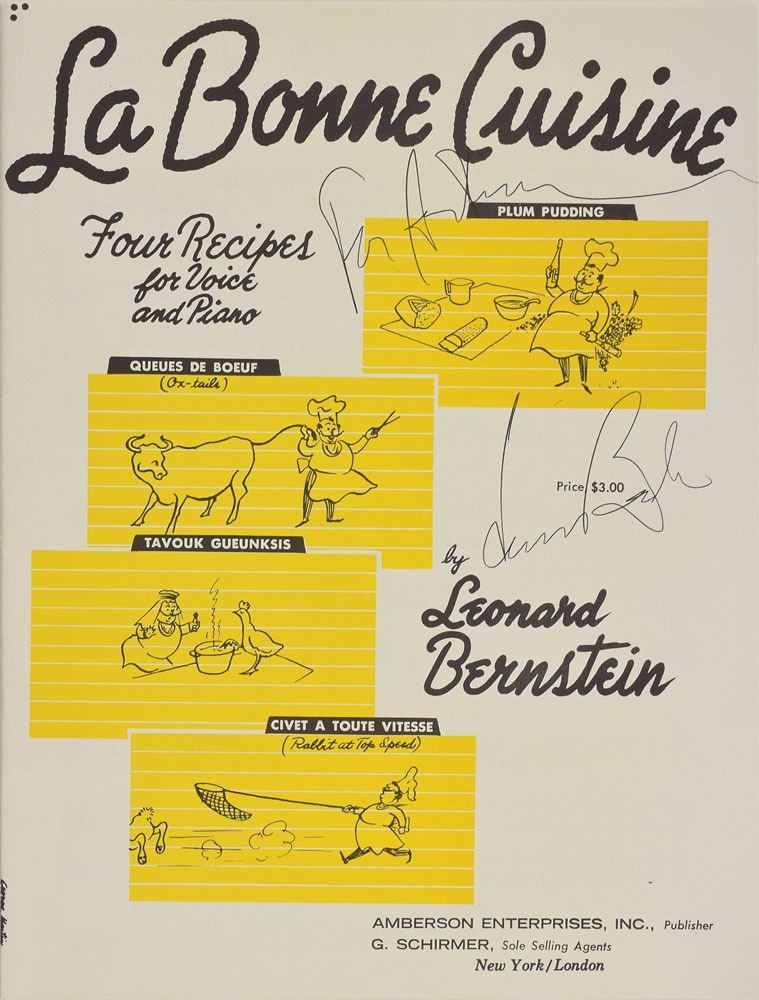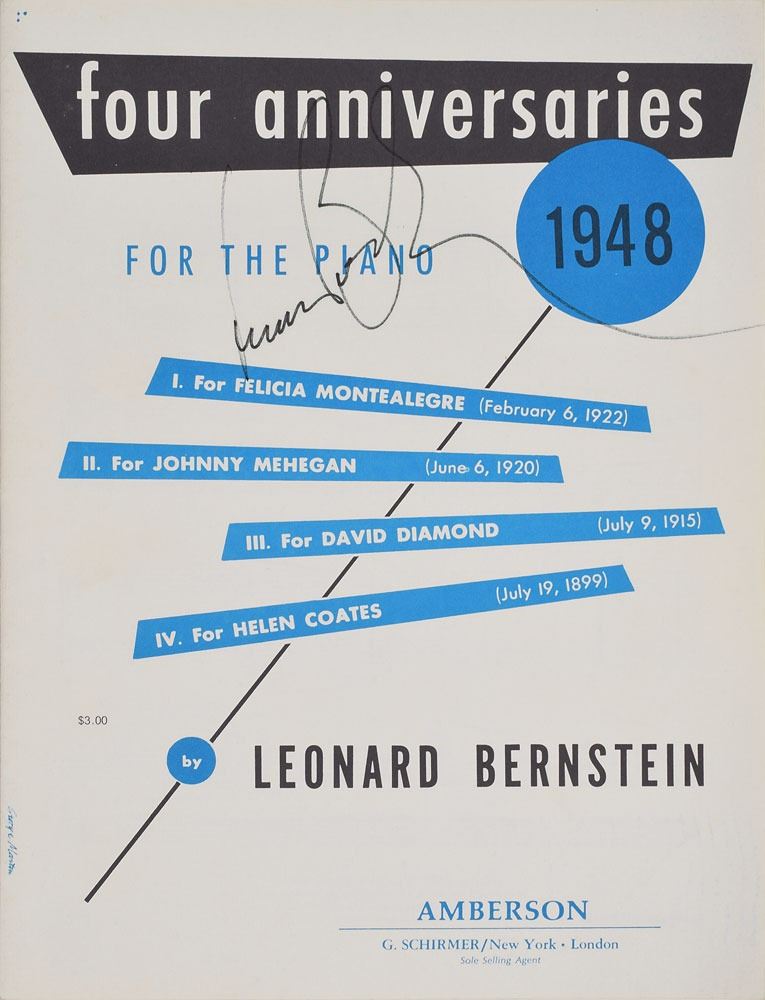 Group of four piano scores for works by Bernstein: Four Anniversaries, signed on the front cover in black felt tip; Seven Anniversaries, signed on the front cover in black felt tip; La Bonne Cuisine, signed and inscribed on the front cover in black ink; and I Hate Music!, signed on the first page in black felt tip. In overall fine condition.