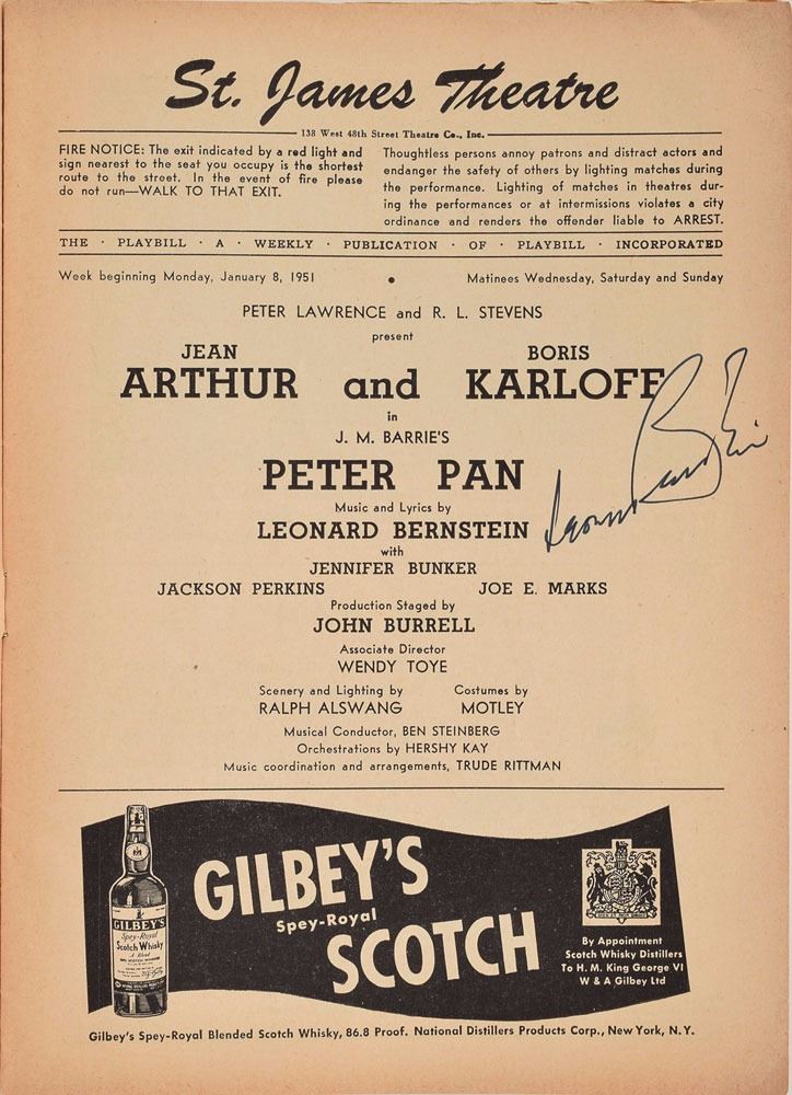 Two items: a Playbill for performances of Peter Pan at the St. James Theatre beginning the week of January 8, 1951, twenty-four pages, 6.4 x 9, signed on the title and cast page in black ink by Bernstein; and a sheet music booklet for the song ‘Ya Got Me,’ five pages, 9 x 12, signed on the front cover in black felt tip by Bernstein, Betty Comden, and Adolph Green. In overall very good to fine condition, with Playbill cover detached but present, and a small tear and slight creasing to booklet.