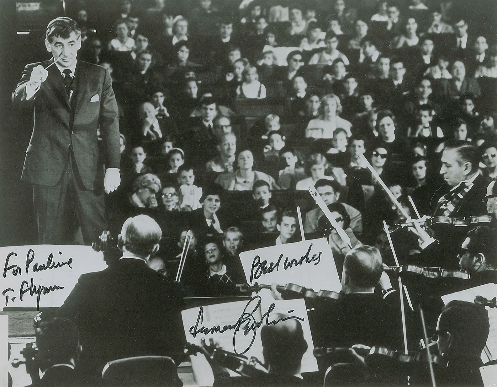 Glossy 9.25 x 7.25 full-length photo of Bernstein conducting an orchestra before a packed concert hall, thoughtfully signed and inscribed within the photo's white spaces in black felt tip, "For Pauline T. Flynn, Best wishes, Leonard Bernstein.” In very good to fine condition, with scattered light creasing.