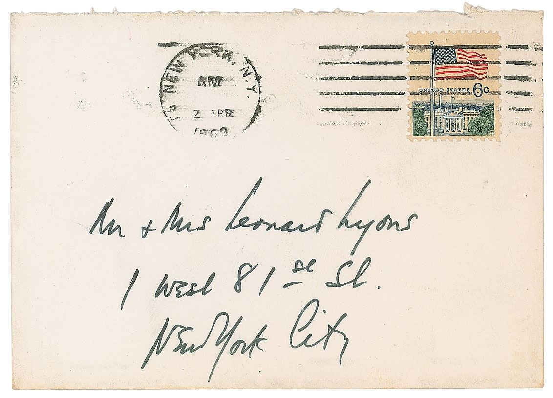 ALS signed “Lenny,” one page on a 4.5 x 3.25 personal notecard, postmarked April 2, 1969. Letter to Sylvia and Leonard Lyons, a New York Post columnist renowned for his syndicated column 'The Lyons Den.' In full: "I love your little gift notebook! I can't explain why the other one went astray, but double thanks for your double try!" In fine condition, with a light crease to the lower right corner. Accompanied by the original mailing envelope addressed in Bernstein's hand.