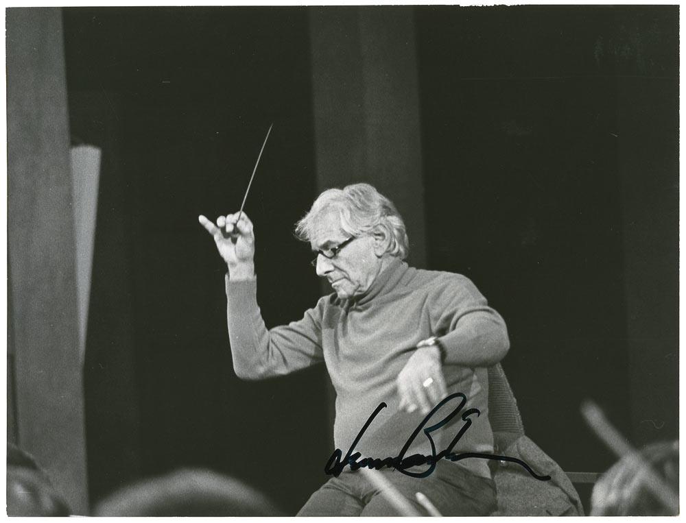 Glossy 7 x 9.25 photo of Bernstein on the podium, signed in black felt tip. Scattered bends, dings, surface impressions, and tiny spots of skinning, otherwise fine condition. RRAuction COA.