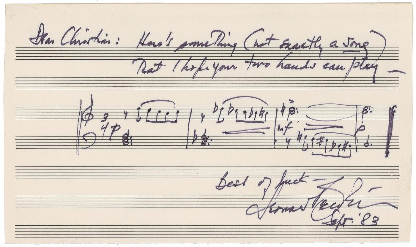 AMQS on an off-white 10 x 6 musically-lined page. Bernstein pens a bar of music and writes, “Here’s something (not exactly a song) that I hope your two hands can play—Best of luck—Leonard Bernstein Sept. ‘83.” In fine condition.