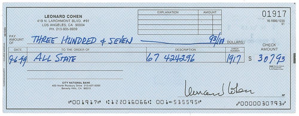 Personal check, 8.75 x 3.25, filled out in another hand and signed by Cohen, payable to All State for $307.93, September 6, 1999. In fine condition, with a Beckett Authentication Services label affixed to the reverse. Accompanied by a certificate of authenticity from Beckett.