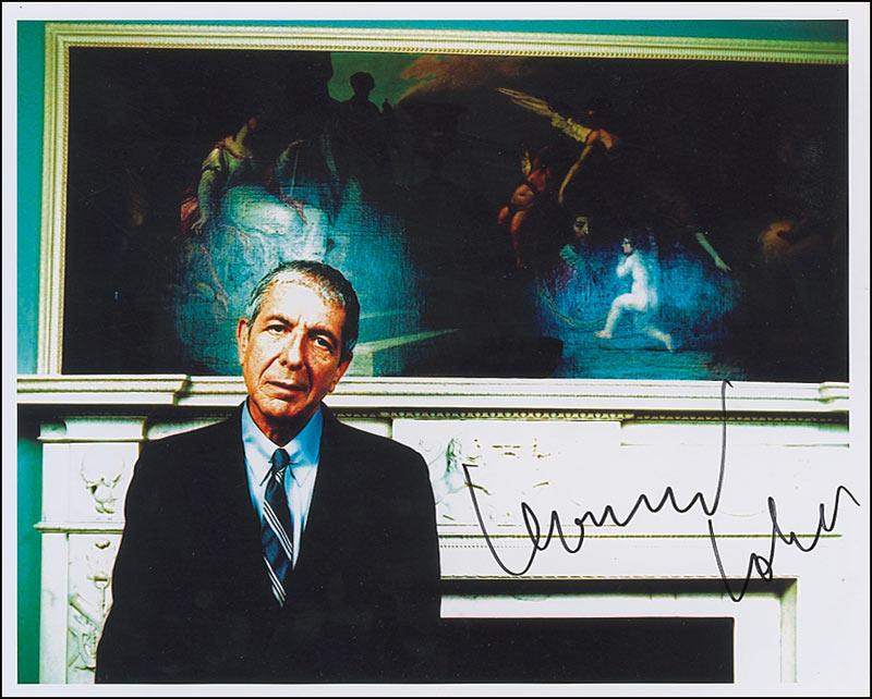 Color satin-finish 9.75 x 8 photo of Cohen posing in front of a mantle, signed in black felt tip. In fine condition.