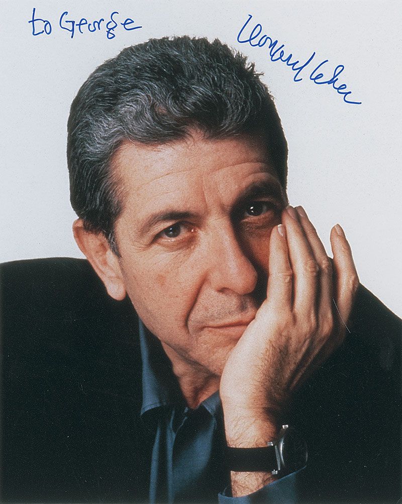 Color satin-finish 8 x 10 photo of Cohen resting his chin on his hand, signed and inscribed in blue felt tip, “To George, Leonard Cohen.” In fine condition.