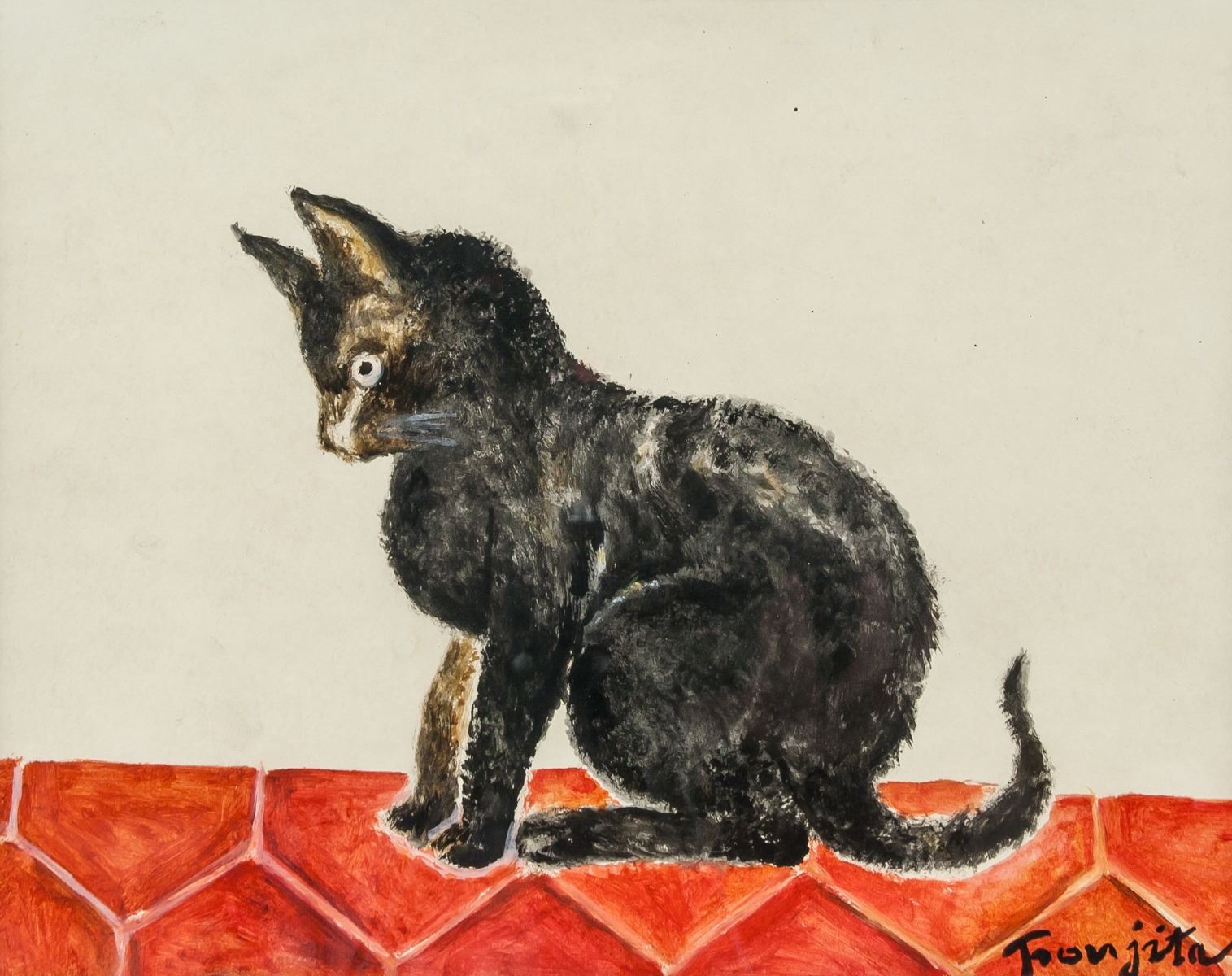 Mixed media on paper, watercolor and ink, framed. Featuring a cat on tiled floor. Signed Foujita on the lower right corner. Attributed to Leonard Tsuguhara Foujita (1886-1968, Japanese). 19.5 x 24 cm (7.7 x .9.5 inches). Frame size: 36.5 x 44 cm (14.3 x 17.3 inches). PROVENANCE: Southern Ontario estate