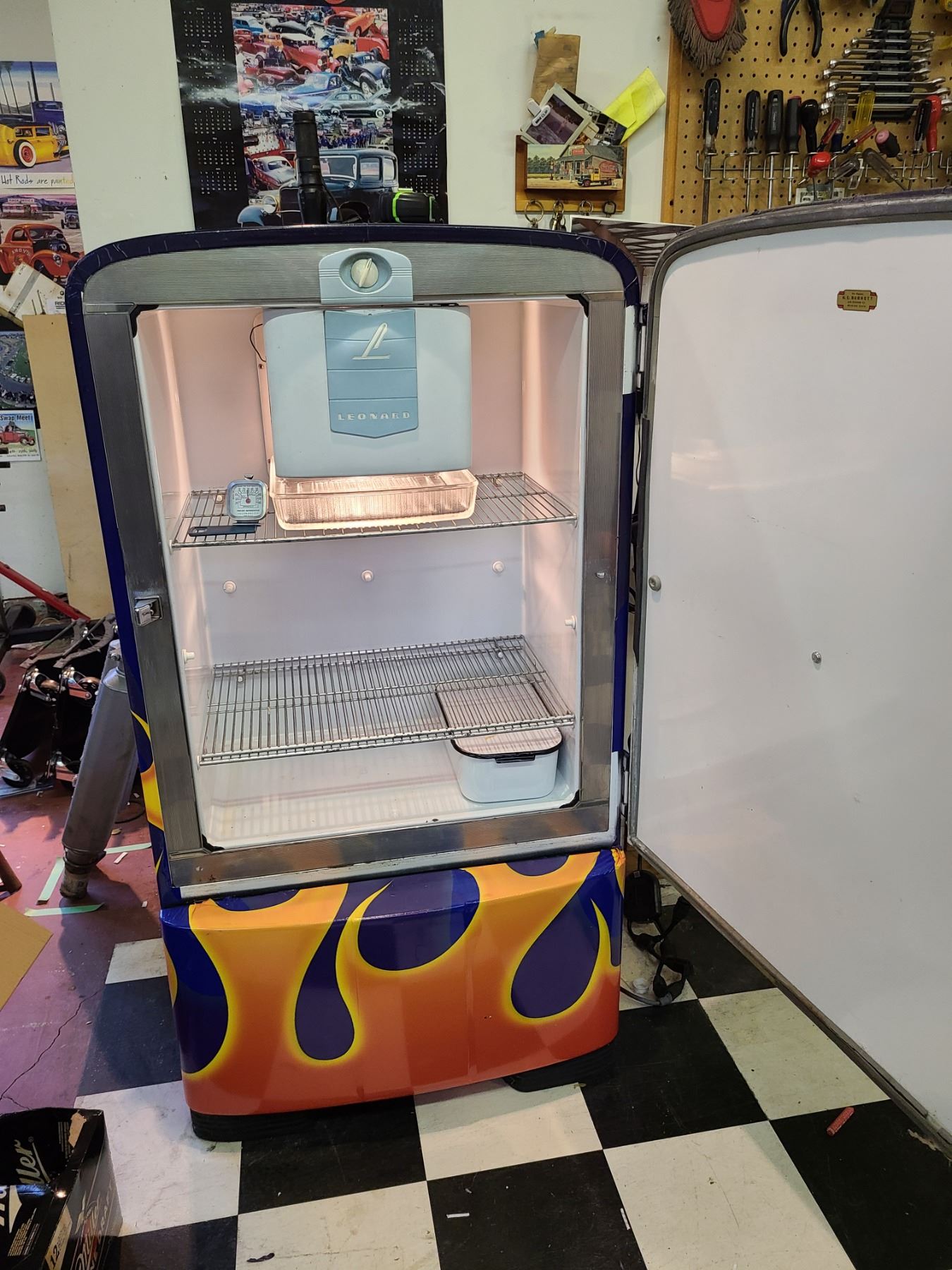 Fridge has original handles. Works. 50s fridge with a flame wrap. Pickup at 11