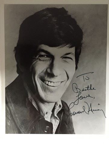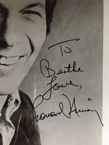 Signed autograph to Bertha: 1970s signed 8x10 photograph of Leonard Nimoy - signed directly by him in person. This poster is from the estate of a woman that worked at the Shubert Theater in Los Angeles for many years. She collected many items over the years and became frineds with many of the ators and crew of several productions.
