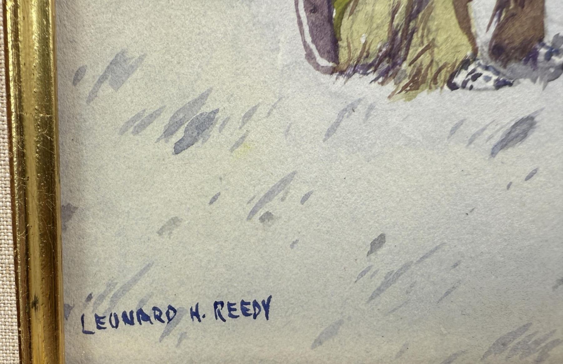 Title is Blackfoot Indian. 7 1/2" by 10 1/2" unframed, 12 5/8" by 15 1/4" framed. Watercolor on Paper. Leonard Howard Reedy (1899 - 1956) was active/lived in Illinois. Leonard Reedy is known for Western theme painting. Leonard Reedy was a landscape and figure painter, born in Chicago, Illinois, April 24, 1899. He studied at the Chicago Institute and Academy of Fine Arts as well as self-taught. At the age of ten he demonstrated an unusual aptness and fondness for drawing and painting and chose to manifest this talent by illustrating the margins of his schoolbooks with his heroes of the west: Indians, cowpunchers, and bandits. He was a great admirer of Frederick Remington whose portrayal of the West and Frontier Days will forever be appreciated and cherished as historically preserving the early pioneering, indomitable spirit and tradition of a great bygone era in American History. Like Remington, Reedy lived in the 'Great Open Spaces' and was at home on the Great Plains, the desert country, mountains, as well as mining and timber camps. He worked as a ranch hand. He roamed with the Indians. Over a period of many years, he gained a bountiful knowledge of western life and of the subjects he loved to portray. No doubt his great love and admiration for the early rough and rugged West of long ago decided for him what to paint. He preserved and described action which showed characters true to their habits and period; Frontier days of the plainsman; sagebrush; cactus and mesquite; The Gold rush; frontier towns; the stage coach; the hold up; the covered wagon; Buffalo Bill and the scouts; Soldiers and Indian warfare; the western trek of the home-seeker, fraught with constant danger; war-painted Indians on the warpath; the attack; bleached bones on the prairie; the tireless search for gold; all preserved the outstanding incidents of the pioneer days, the hardships and struggles during a most important epoch of our nation's history.