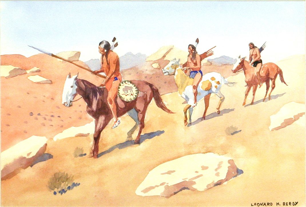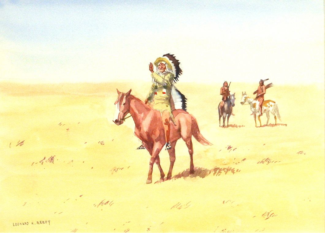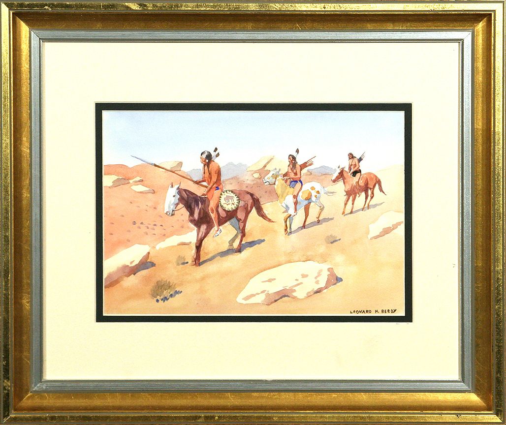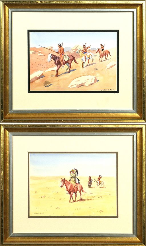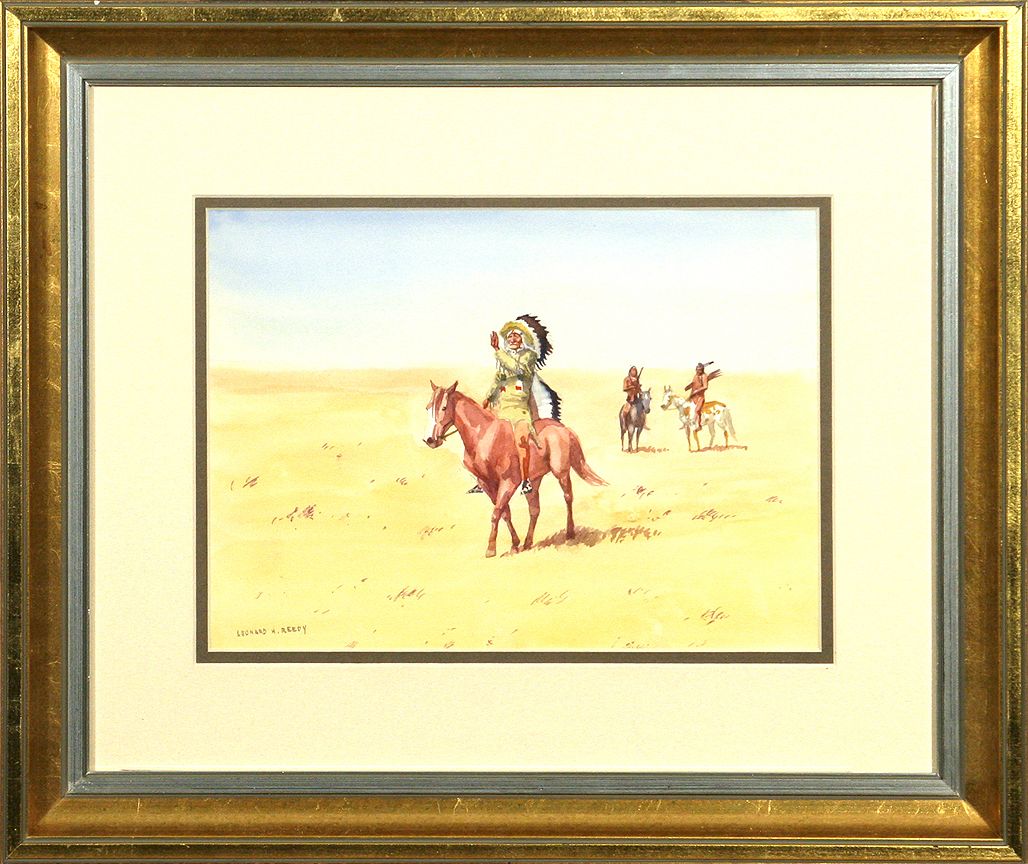 Leonard H. Reedy (1899-1956). Two 8" x 11" watercolors. 1. Cheyenne Warriors. Signed lower right: LEONARD H. REEDY. 2. The Peace Sign. Signed lower left: LEONARD H. REEDY. (est. $1,500-2,500). CONDITION REPORTS: www.auctioninsantafe.com/docs/cr2012.pdf