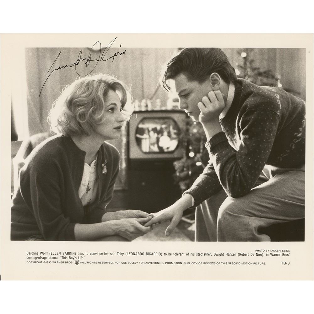 Glossy 10 x 8 Warner Bros. publicity photo of Leonardo DiCaprio and Ellen Barkin in the 1993 film This Boy's Life, signed in black ink by DiCaprio. In fine condition.
