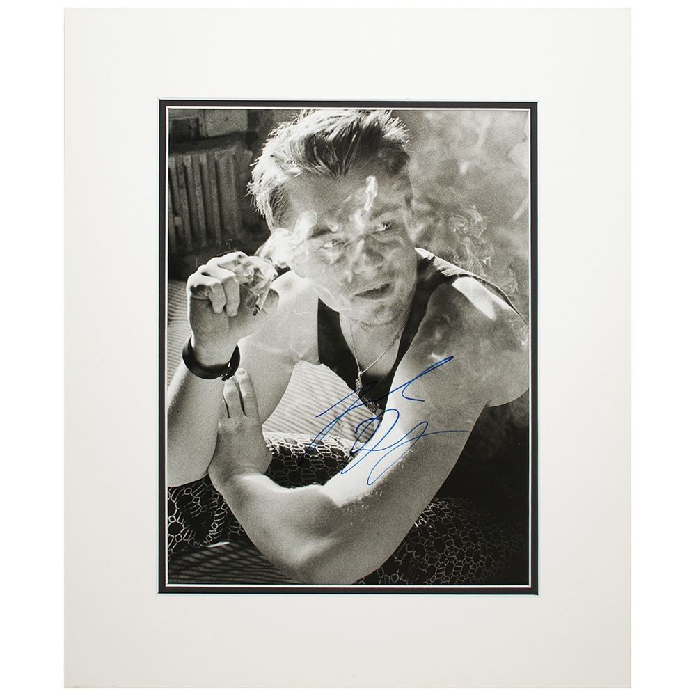 Semi-glossy 7.75 x 10.25 magazine photo of Leonardo DiCaprio seated and smoking a cigarette, signed in blue felt tip. Matted to an overall size of 12.25 x 14.75. In fine condition.