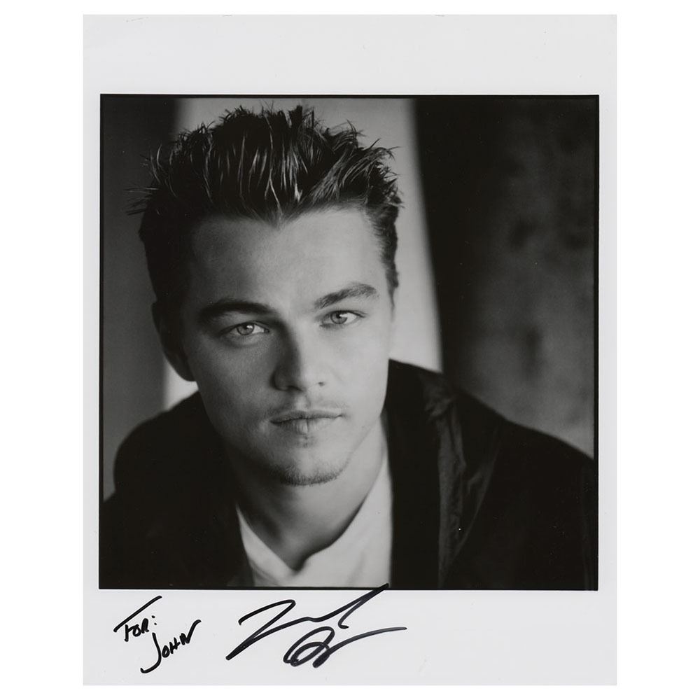 Handsome glossy 8 x 10 photo of the young actor, signed and inscribed in black felt tip, "For John: Leonardo DiCaprio.†In fine condition, with small corner creases.
