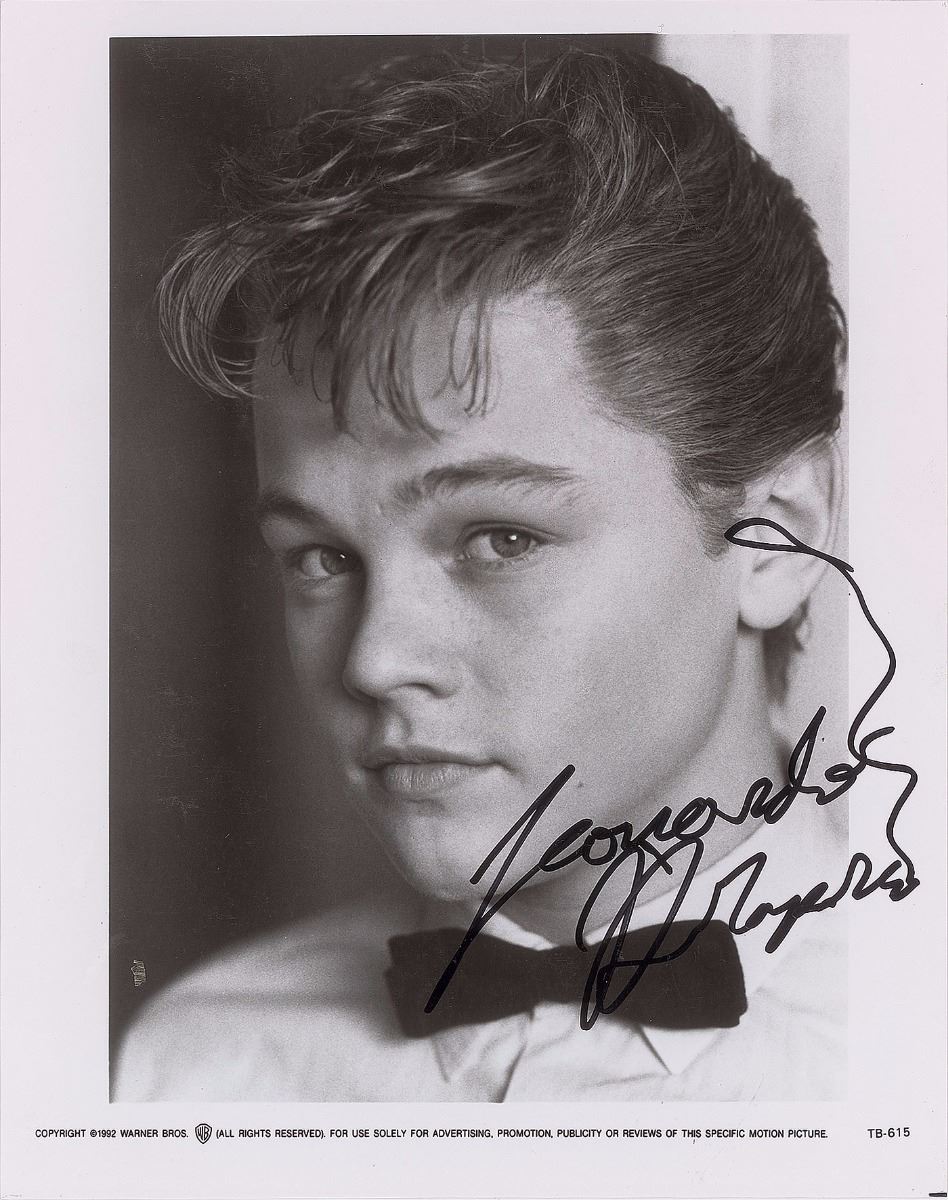Wonderful glossy 8 x 10 Warner Brothers publicity photo of a young DiCaprio, signed in black felt tip. In fine condition.