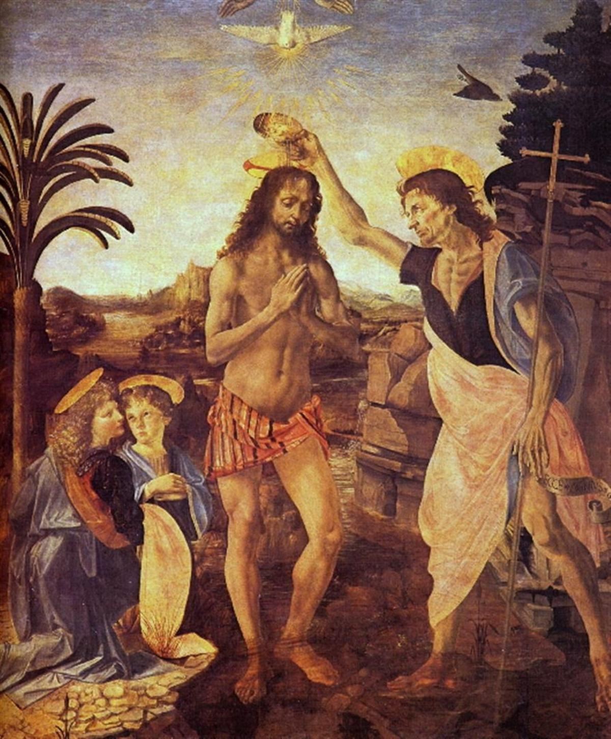 Artist: Leonardo da Vinci - Title: Christs Baptism - Medium: Fine Art Giclee on Canvas - Image Size: Approximately 20 inches x 17 inches - Unframed on Unstretched Canvas - Biography: Leonardo da Vinci (15 April 1452 - 2 May 1519) was an Italian polymath of the High Renaissance who was active as a painter, draughtsman, engineer, scientist, theorist, sculptor and architect. While his fame initially rested on his achievements as a painter, he also became known for his notebooks, in which he made drawings and notes on a variety of subjects, including anatomy, astronomy, botany, cartography, painting, and paleontology. Leonardo's genius epitomized the Renaissance humanist ideal, and his collective works compose a contribution to later generations of artists matched only by that of his younger contemporary, Michelangelo
