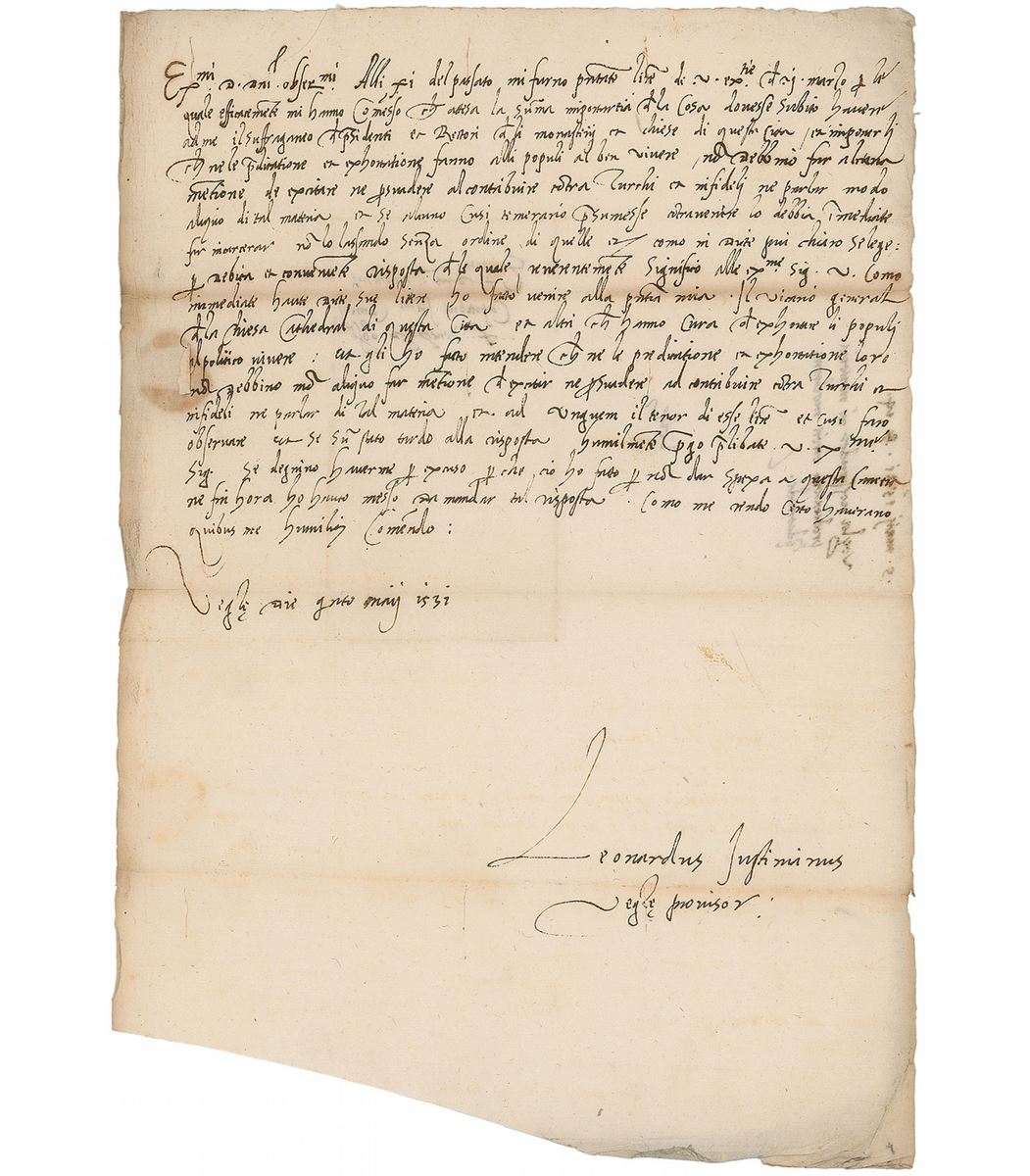 ALS in Italian, one page, 8.5 x 12.5, May 5, 1531. Untranslated letter to the Council of Ten in Venice. In very good condition, with intersecting folds, scattered creases and toning, a bit of show-through from docketing to reverse, and a cut to the lower left. Justinianus was governor of the Croatian island Krk, which stood under Venetian control since 1480. He had been ordered to inform monasteries, churches, and communities of the island that their preachers should calm down the people in face of the Turkish army danger and neither preach against the Turks nor introduce any tax. Jusitinianus met the vicar-general and the priests and told them to execute this command ‘ad unguem’ on pain of penalties.